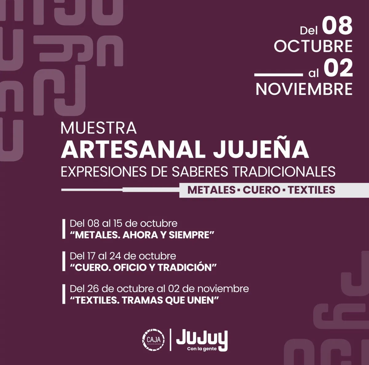 Desde hoy y hasta el 15 de octubre del año en curso, la muestra comienza con “Metales. Ahora y siempre”; luego, a partir del 17 hasta el 24 del presente mes será de “Cuero. Oficio y tradición”; y finalmente a partir del 26 hasta el 2 de noviembre la exposición será de “Textiles. Tramas que unen”.