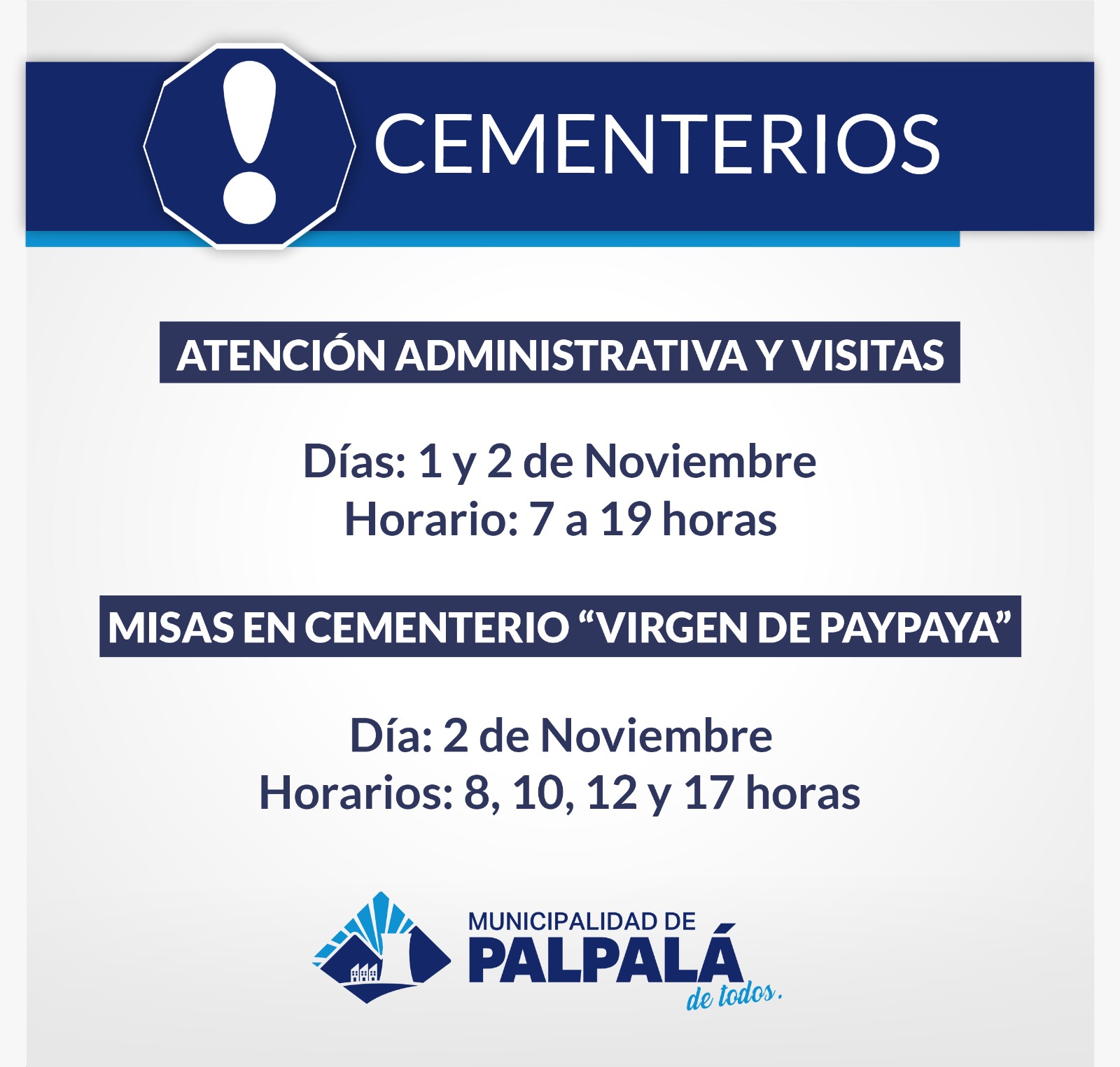 En el marco del día de todos los Santos y Fieles Difuntos, la Municipalidad de Palpalá informa que la atención administrativa y visita en los cementerios Virgen de Paypaya y Nuestra Señora de Río Blanco para los días 1 y 2 de noviembre será en el horario de 7 a 19 horas.
