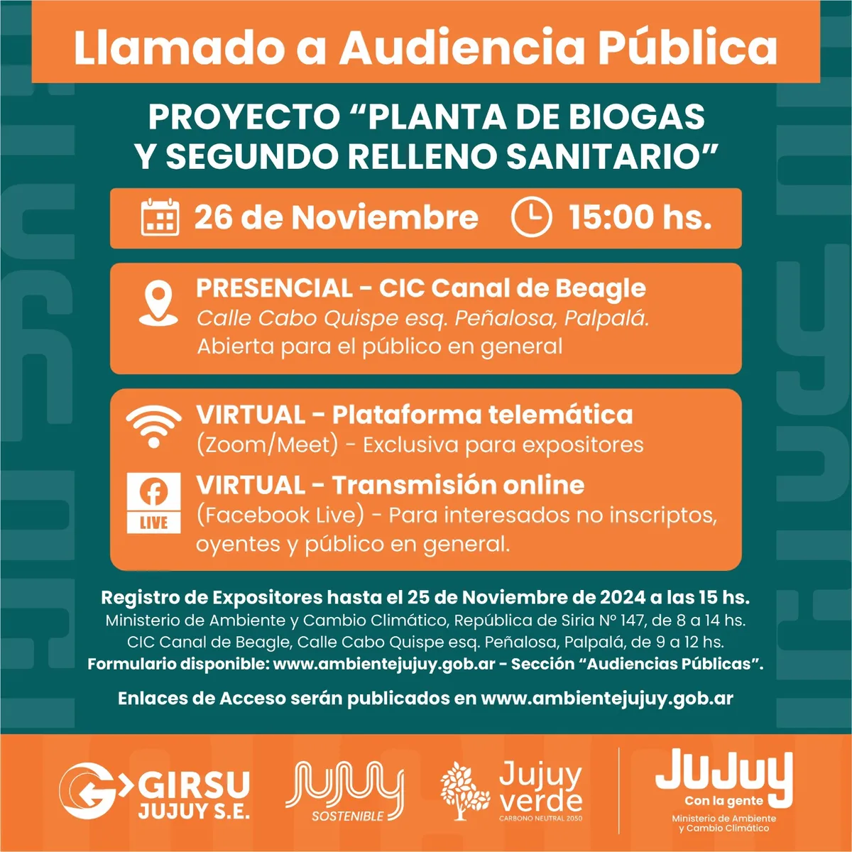 La secretaría de Calidad Ambiental del Ministerio de Ambiente y Cambio Climático de Jujuy, convoca a una Audiencia Pública donde se presentará el Estudio de Impacto Ambiental del proyecto “Planta de Biogás y Segundo Relleno Sanitario”, propuesto por la empresa GIRSU JUJUY S.E.