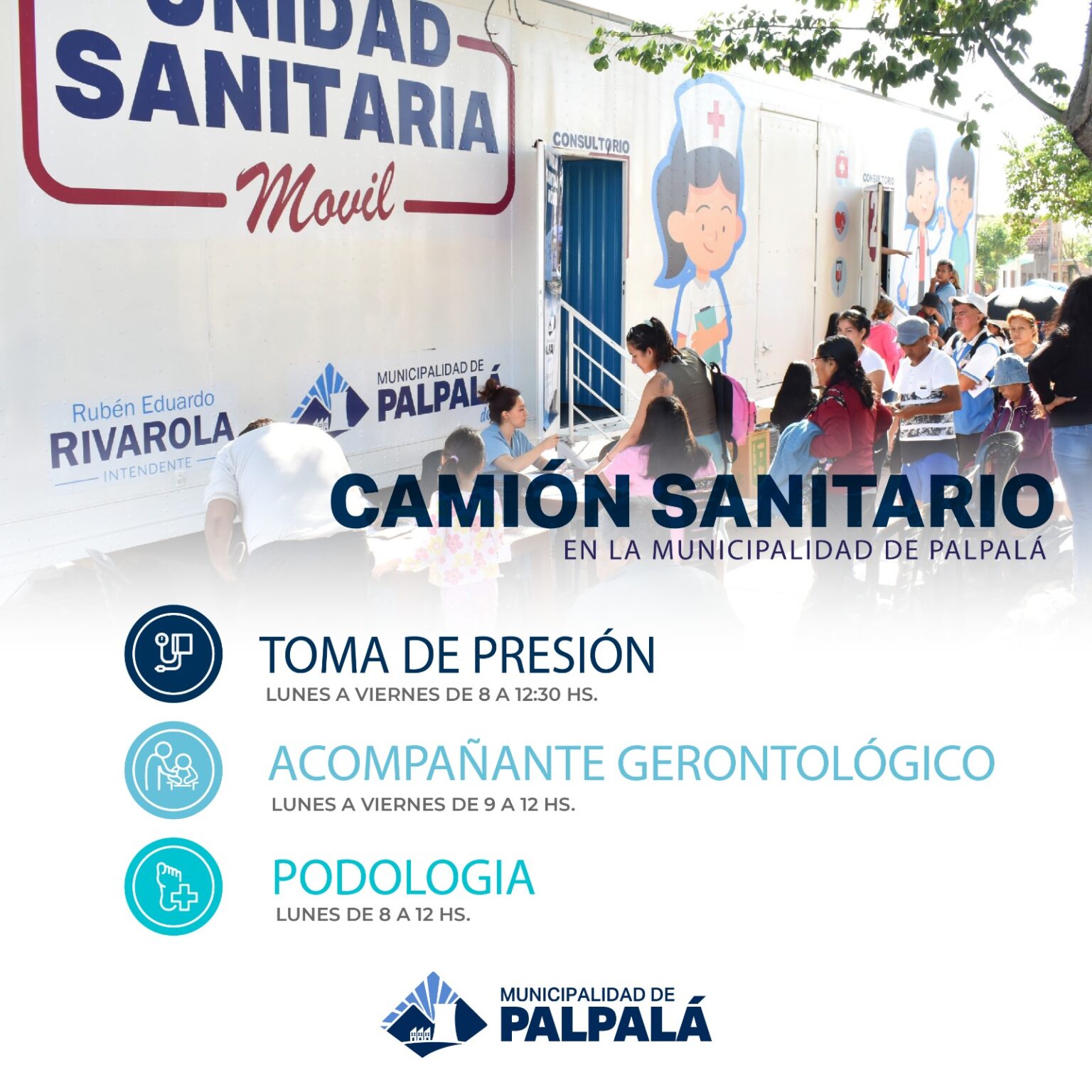 La Municipalidad de Palpalá anuncia la atención del camión sanitario en instalaciones del Centro Cívico, donde brindan atención en toma de presión, acompañante gerontológico y podología.
