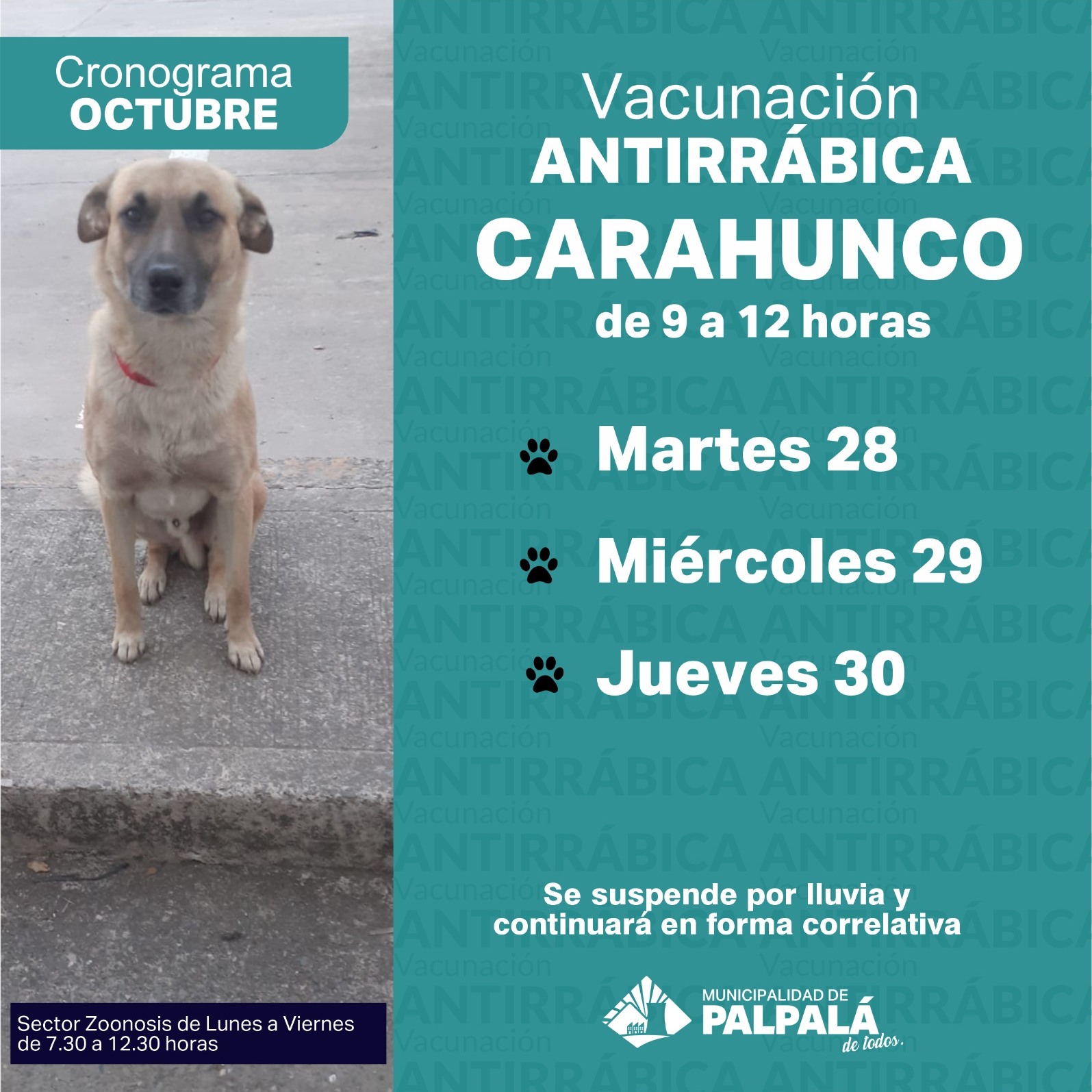 La Municipalidad de Palpalá informa que la campaña de vacunación antirrábica se llevará a cabo en la localidad de Carahunco la próxima semana, de 9 a 12 horas. La vacunación se realizará puerta a puerta los días martes 28, miércoles 29 y jueves 30 del corriente.