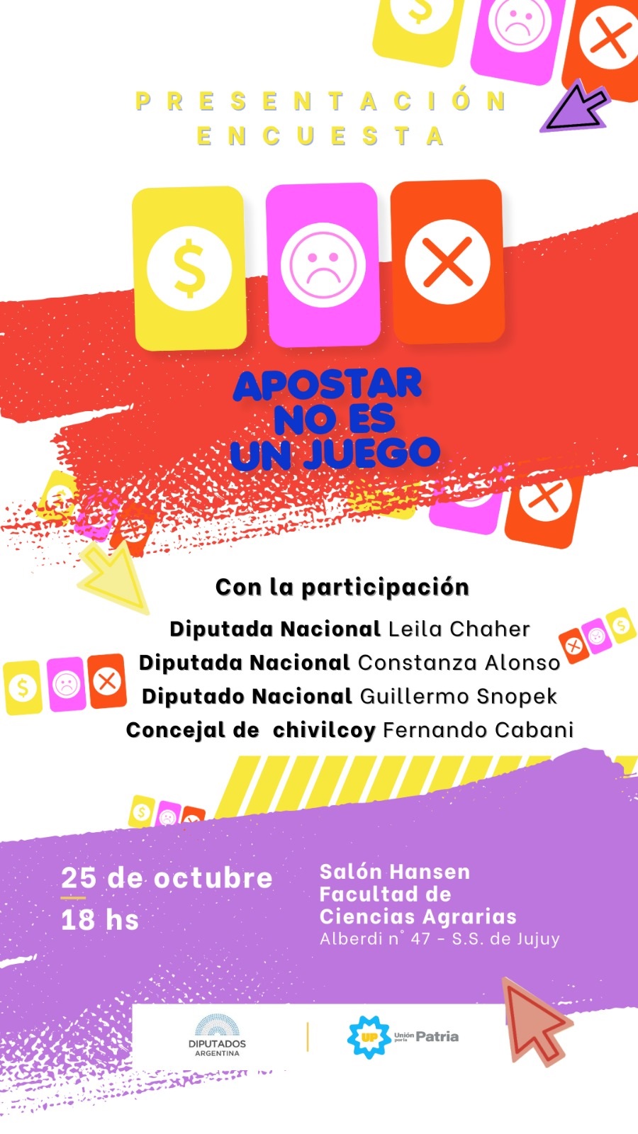 Los diputados nacionales Leila Chaher, Constanza Alonso y Guillermo Snopek junto al Concejal de Chivilcoy, Fernando Cabany presentarán el informe de la encuesta nacional “Apostar no es un Juego”, el próximo viernes 25 de octubre a las 18 horas en el Salón Hansen de la Facultad de Ciencias Agrarias, ubicada en calle Alberdi Nº 47 de la ciudad de San Salvador de Jujuy.