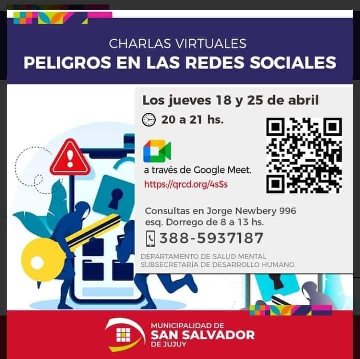 Al respecto, Adriana Bellman, jefa del Departamento de Salud Mental, invitó “al público en general a dos charlas virtuales que vamos a dar este jueves 18 y el jueves 25 de abril a las 20 horas a través de la plataforma Google Meet”, y explicó que “se trata de charlas abiertas al público en general, cualquier persona puede acceder mediante la información que está en el flyer que está en nuestro Facebook: Departamento de Salud Mental, del municipio de San Salvador de Jujuy, allí pueden encontrar el link y también el código QR que lo tienen que escanear para poder ingresar a la primer charla”.
