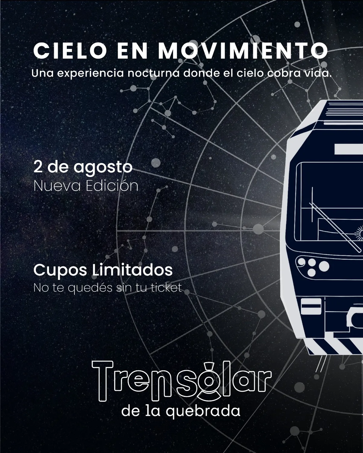 El innovador ciclo “Cielo en Movimiento”, a bordo del Tren Solar de la Quebrada, se convirtió en un éxito antes de su estreno: la primera edición del 25 de julio está completamente agotada y ya está disponible una nueva fecha en agosto.