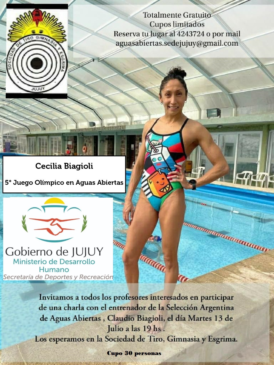 El Ministerio de Desarrollo Humano a través de la Secretaría de Deportes y Recreación mediante un trabajo conjunto con Sociedad de Tiro, Gimnasia y Esgrima invitan a profesores de Educación Física interesados en participar de una clínica con el entrenador de la Selección Argentina de Aguas Abiertas, Claudio Biagioli, el día martes 13 de julio a las 19 horas.
