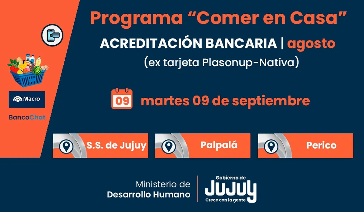 El Ministerio de Desarrollo Humano de Jujuy, mediante la Secretaría de Asistencia Directa, informa que este martes 9 de septiembre se concretó la acreditación bancaria del Programa “Comer en Casa” correspondiente al mes de agosto, para las y los titulares de San Salvador, Palpalá y Perico.