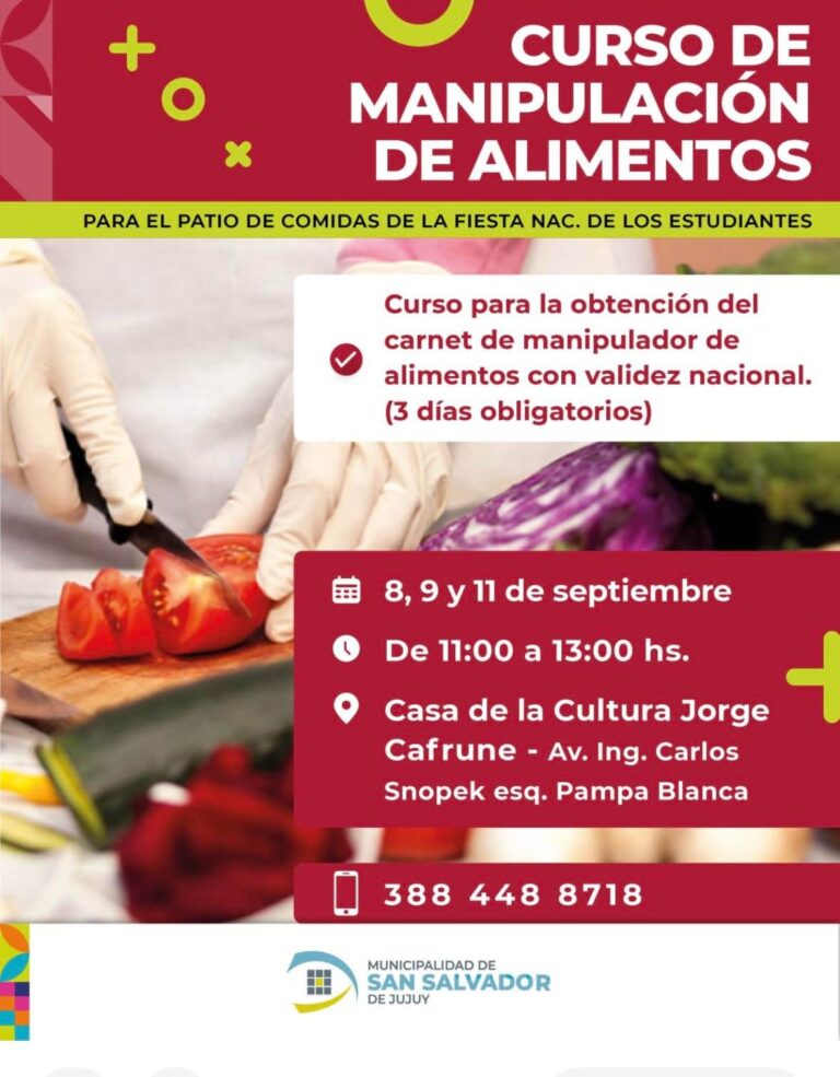 En el marco de la próxima Fiesta Nacional de los Estudiantes (FNE), la Municipalidad de San Salvador de Jujuy convoca a todos los gastronómicos locales a participar del curso para la obtención del carnet de manipulador de alimentos con validez nacional, a dictarse los días 8, 9 y 11 de septiembre, de 11 a 13 horas en las instalaciones de la Casa de la Cultura Jorge Cafrune de Alto Comedero.