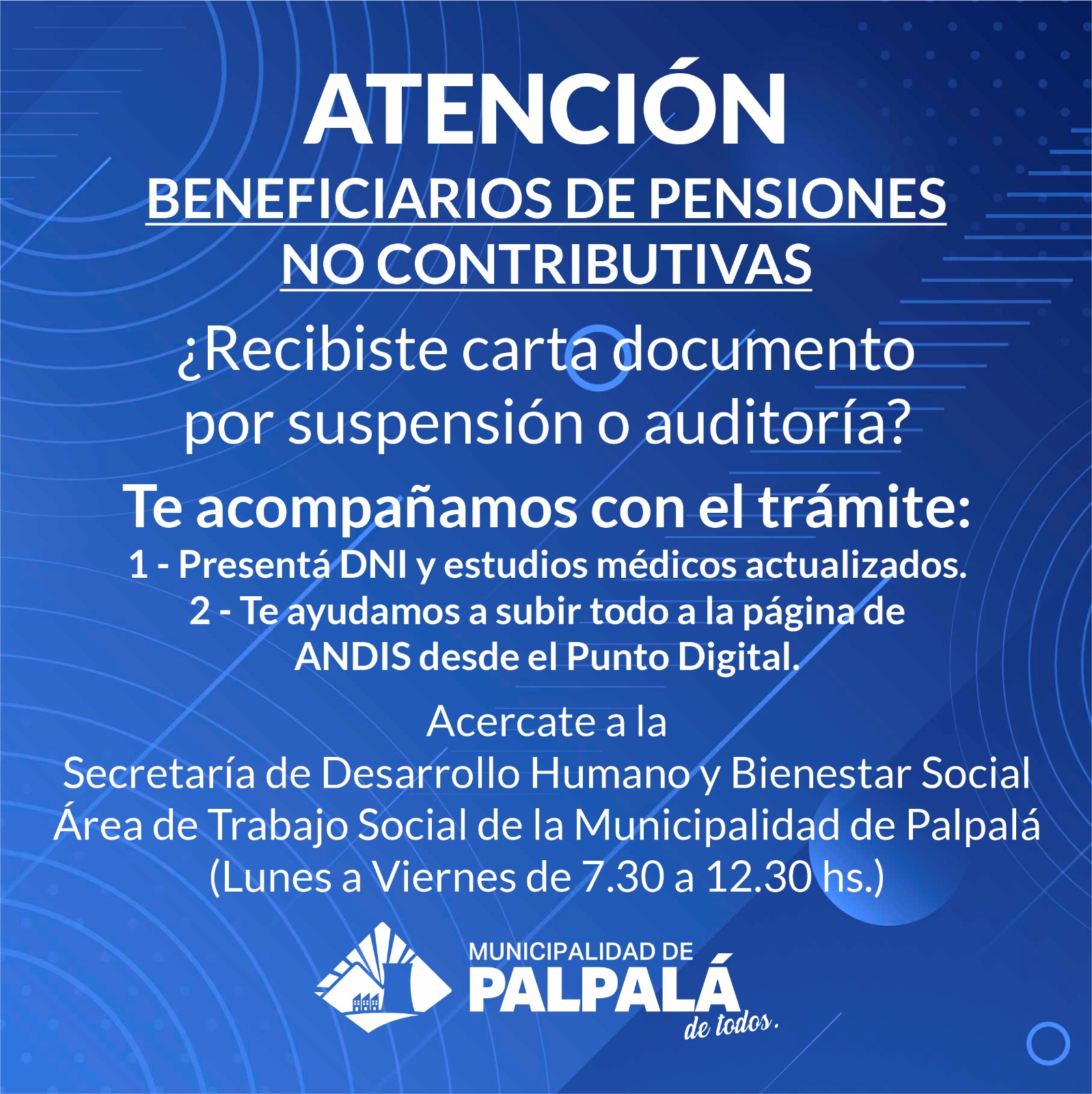 La Municipalidad de Palpalá convoca a beneficiarios de pensiones no contributivas por incapacidad laboral, notificados por suspensión o auditoría, a presentarse en el Centro Cívico la Secretaría de Desarrollo Humano y Bienestar Social, área Trabajo Social de lunes a viernes de 7.30 a 12.30 horas.