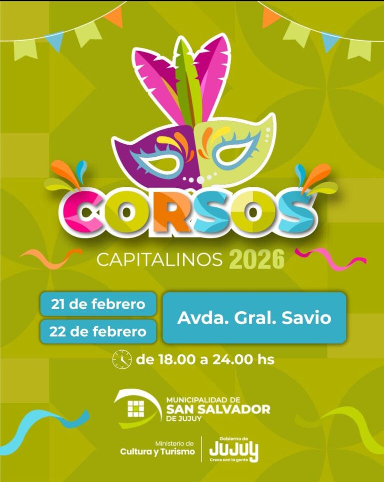 La Municipalidad de San Salvador de Jujuy pondrá el broche de oro a las celebraciones del Carnaval 2026 con la segunda parte de los tradicionales “Corsos Capitalinos”, que se desarrollarán este sábado y domingo sobre avenida Savio, a partir de las 18 horas, con entrada libre y una propuesta pensada para el disfrute de toda la familia.