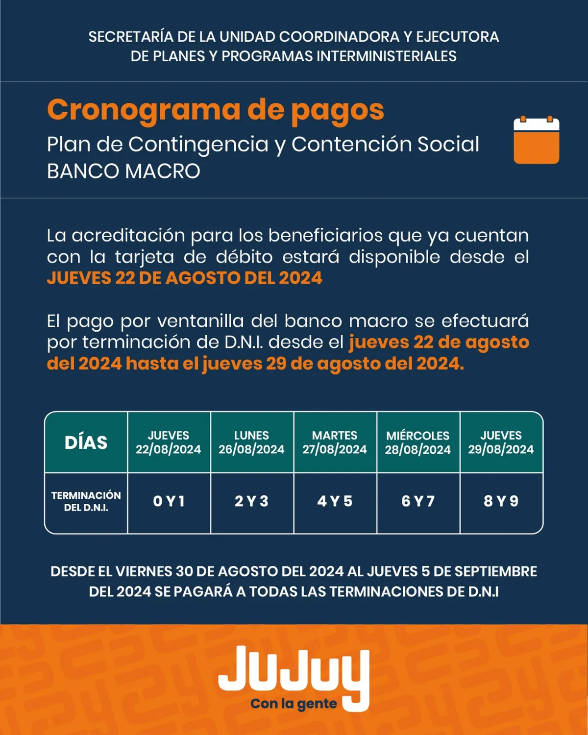 Asimismo, se comunica que desde el viernes 30 de agosto al 5 de setiembre se pagará a todas las terminaciones de DNI.