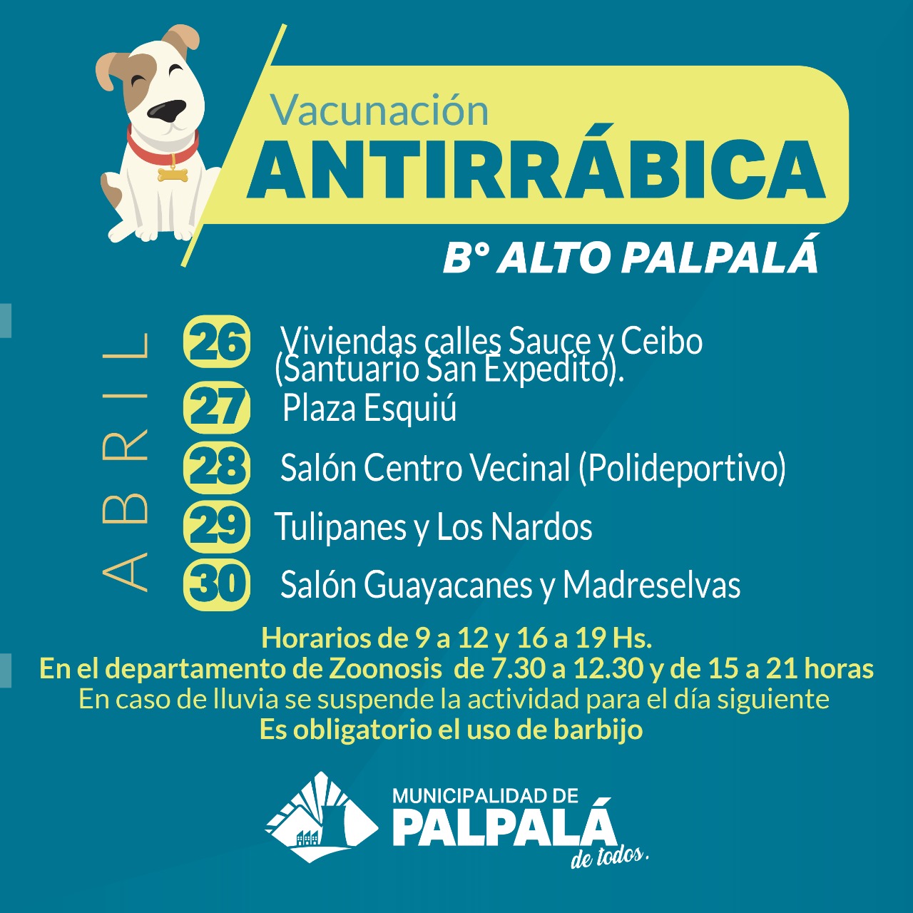 La Municipalidad de Palpalá a través del Departamento de Zoonosis, informa sobre el cronograma de la campaña de vacunación antirrábica en el barrio Alto Palpalá. Este martes 27, Plaza Esquiú, miércoles 28 Salón de Usos Múltiples, jueves 29 en las calles Los Tulipanes y Los Nardos, finalizando el viernes 30 en Salón Guayacanes y Madreselva, de 9 a 12 y 16 a 19 horas. En caso de lluvia la actividad se reprograma para el día siguiente.
