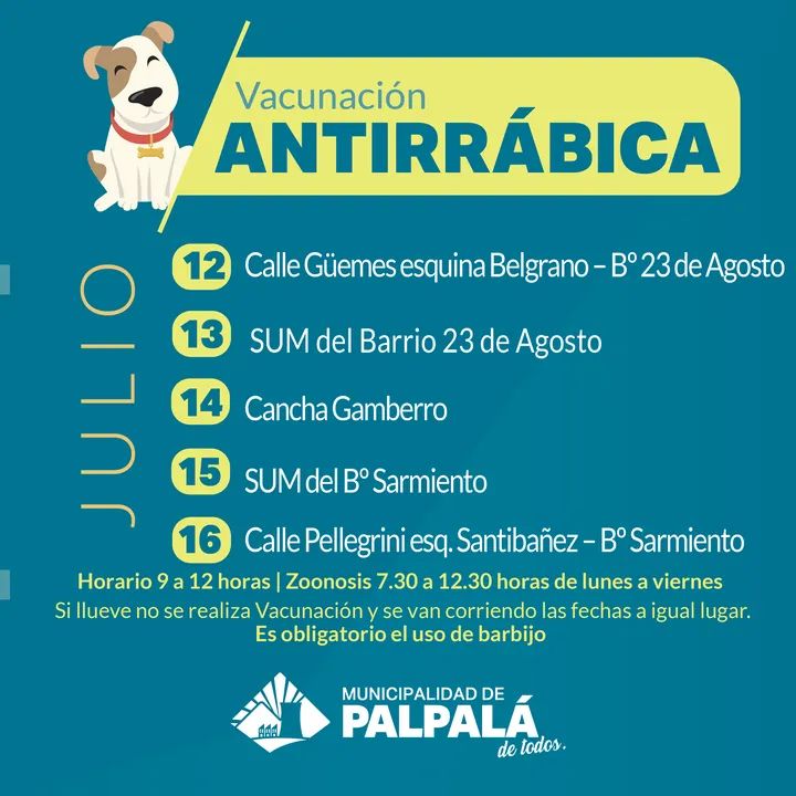 La Municipalidad de Palpalá a través del departamento de Zoonosis comunica que se continúa con la campaña de vacunación antirrábica 2021. Este martes 13 de julio estaremos en el SUM del barrio 23 de Agosto, el miércoles 14 en la cancha de Gamberro, jueves 15 de julio en el SUM del barrio Sarmiento finalizando el día viernes 16 de julio en calle Pellegrini esquina Santibañez del barrio Sarmiento en el horario de 9 a 12 horas. Recordamos a los vecinos el uso obligatorio del barbijo al concurrir con sus mascotas.