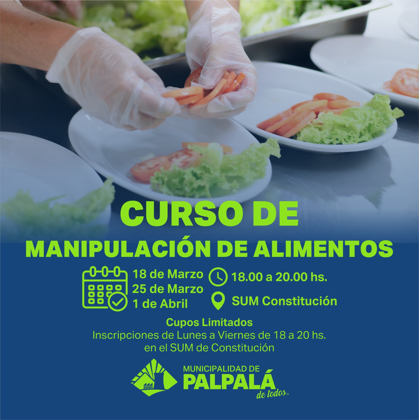La Municipalidad de Palpalá invita a la comunidad a participar del curso de manipulación de alimentos, que se realizara los días 18 y 25 de marzo y 1 de abril, el en SUM del barrio Constitución de 18 a 20 horas. Las inscripciones se realizan de lunes a viernes de 18 a 20 horas en el mismo SUM. Cabe destacar que tiene cupo limitado.