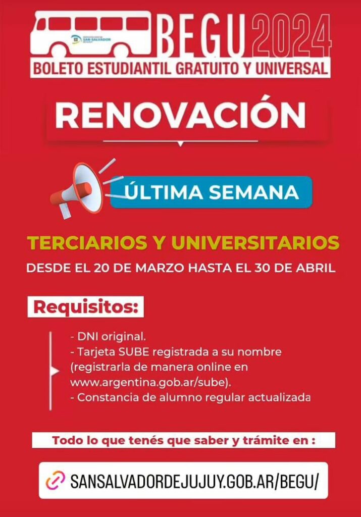 La Municipalidad de San Salvador de Jujuy, a través de la Secretaría de Servicios Públicos recordó que el martes 30 de abril vence el plazo de inscripciones para el beneficio del Boleto Estudiantil Gratuito Universal (BEGU) para los estudiantes del nivel terciario y universitario a través de la página web del municipio.