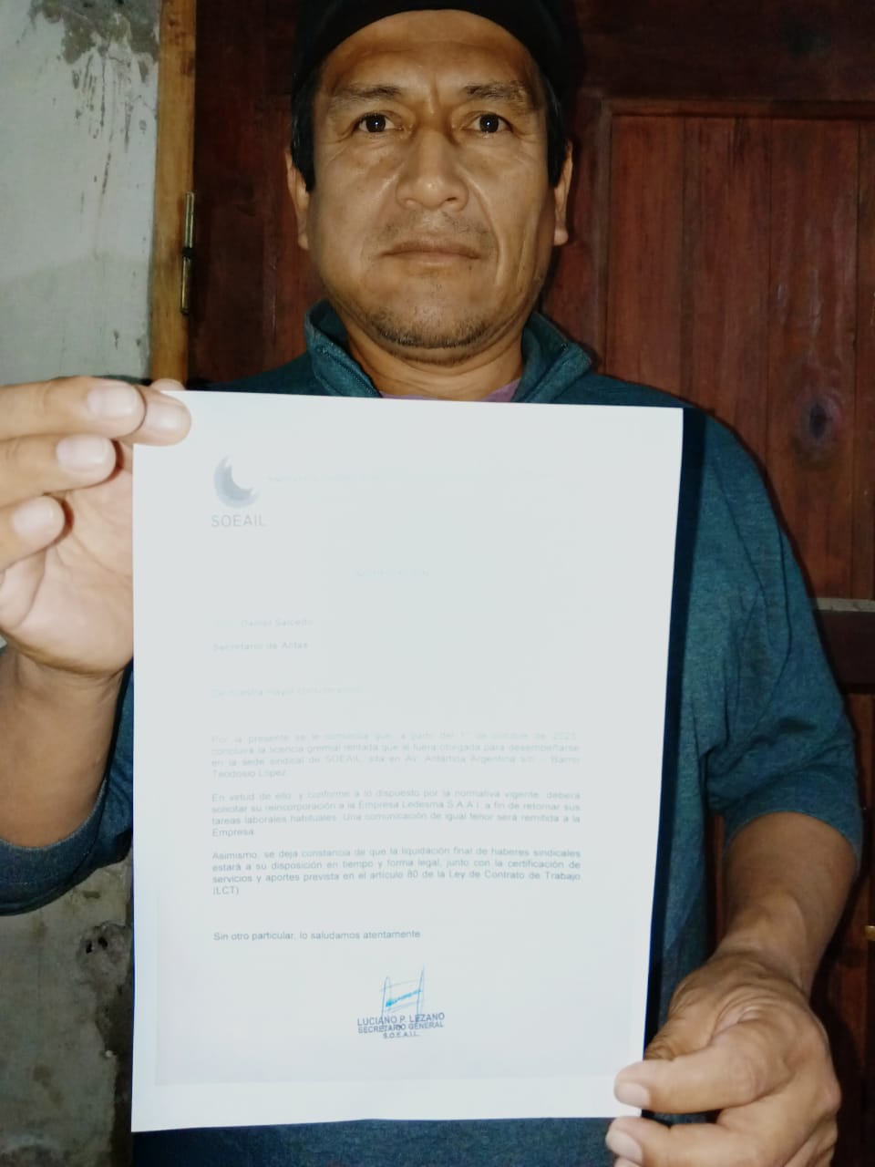 Dos miembros de la comisión directiva del Sindicato de Obreros y Empleados del Azúcar del Ingenio Ledesma (SOEAIL) denuncian que han sido despedidos de manera irregular por el secretario general Luciano Lezano, incumpliendo con todos derechos y garantías establecidas en el estatuto sindical.