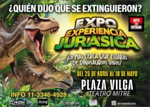 Del 25 de abril hasta el 10 de mayo, de 14 a 21 horas en Plaza Vilca, Teatro Mitre; tanto niños como adultos podrán disfrutar, aprender y compartir de la vida de los dinosaurios y toda su era.