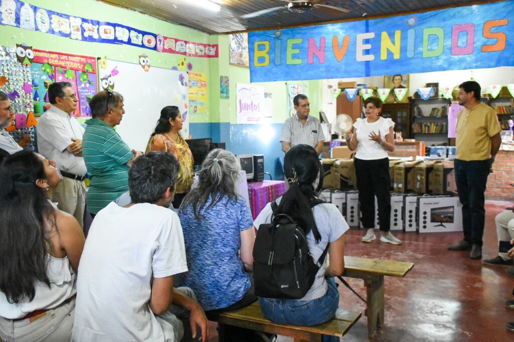 María Inés Zigarán, ministra de Ambiente y candidata a diputada nacional por el Frente Jujuy Crece en Provincias Unidas, entregó diez computadoras de escritorio, dos notebook, seis cámaras de seguridad e impresoras, entre otros dispositivos informáticos para el centro educativo de la Congregación de los Hermanos Maristas en Libertador General San Martín.