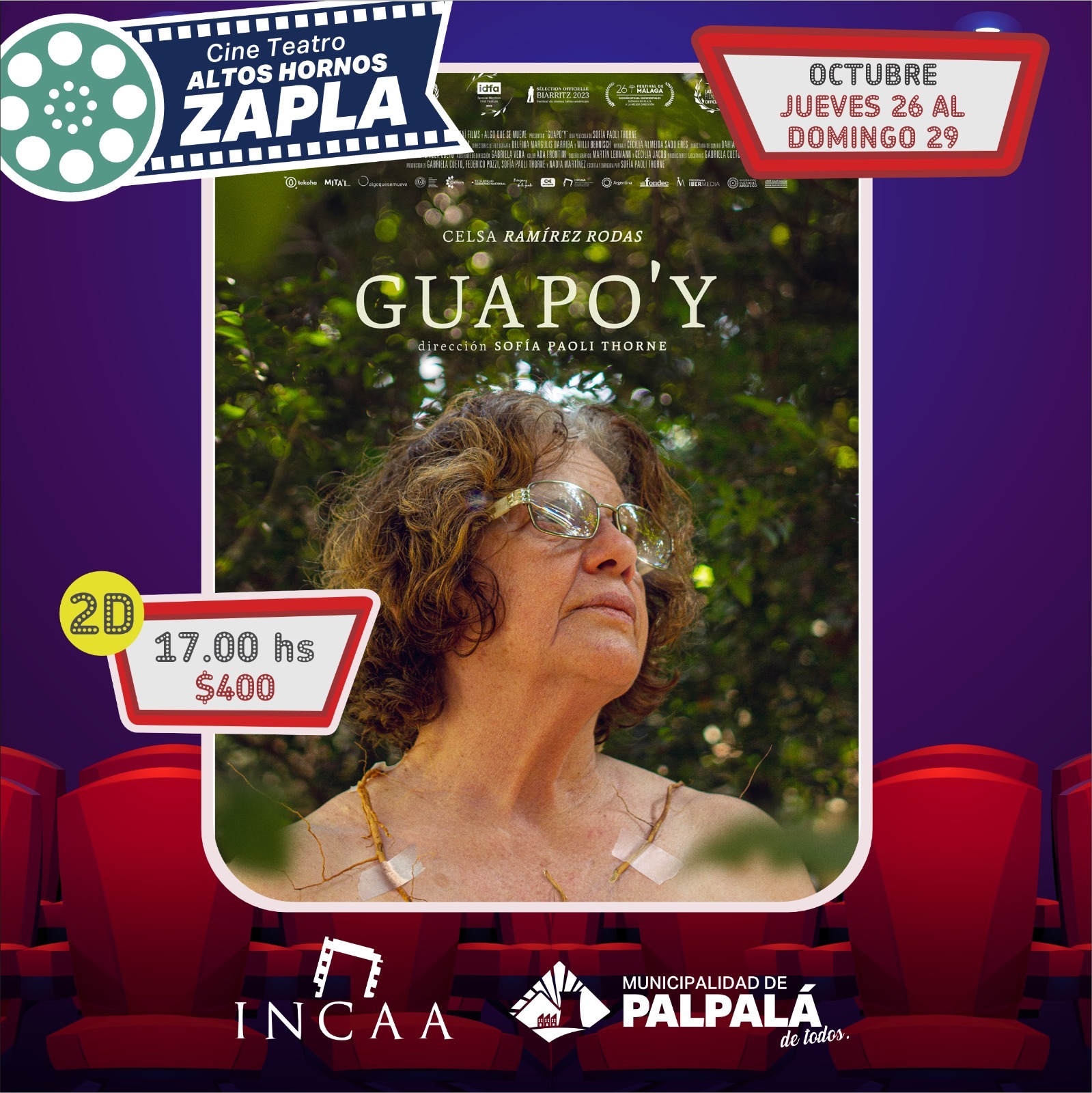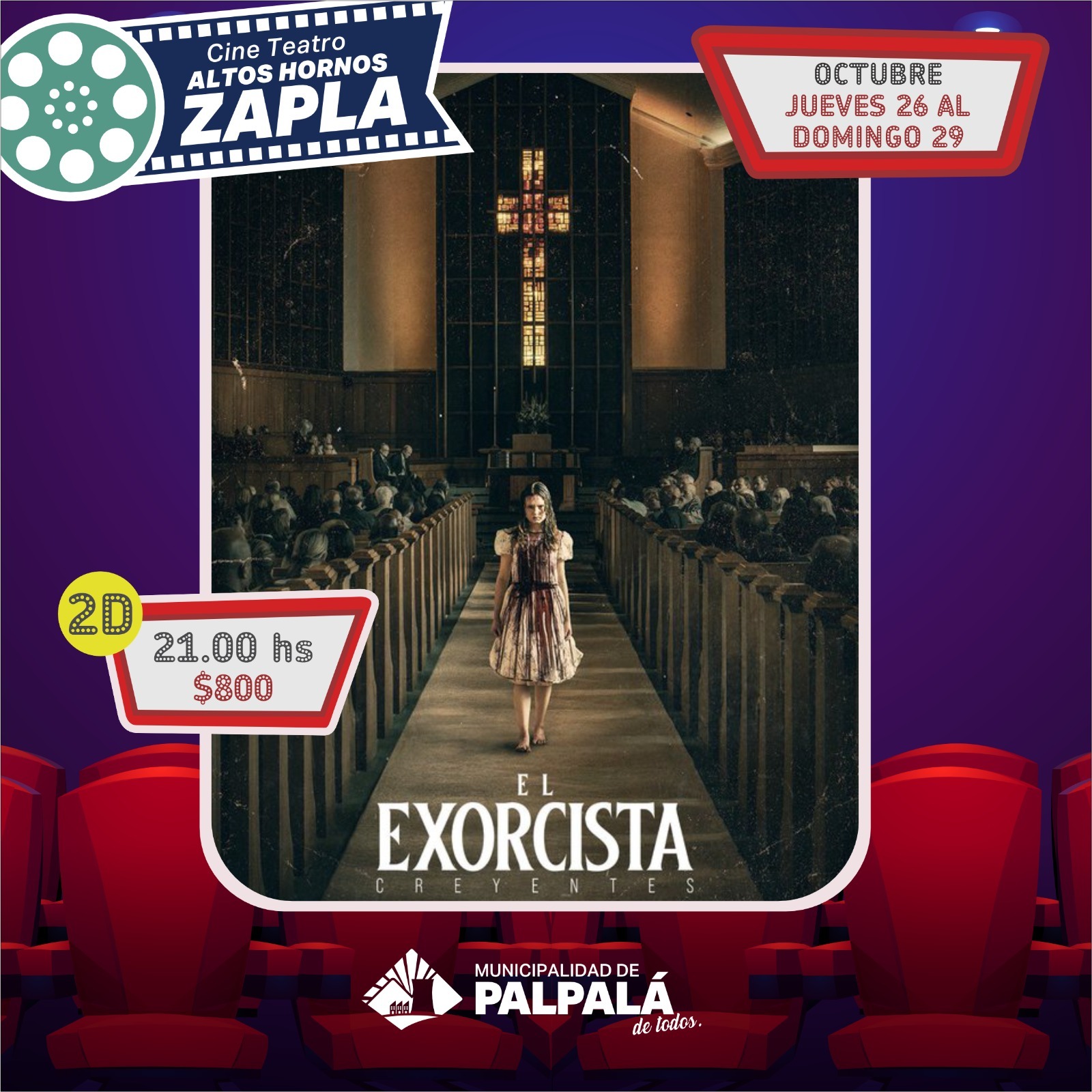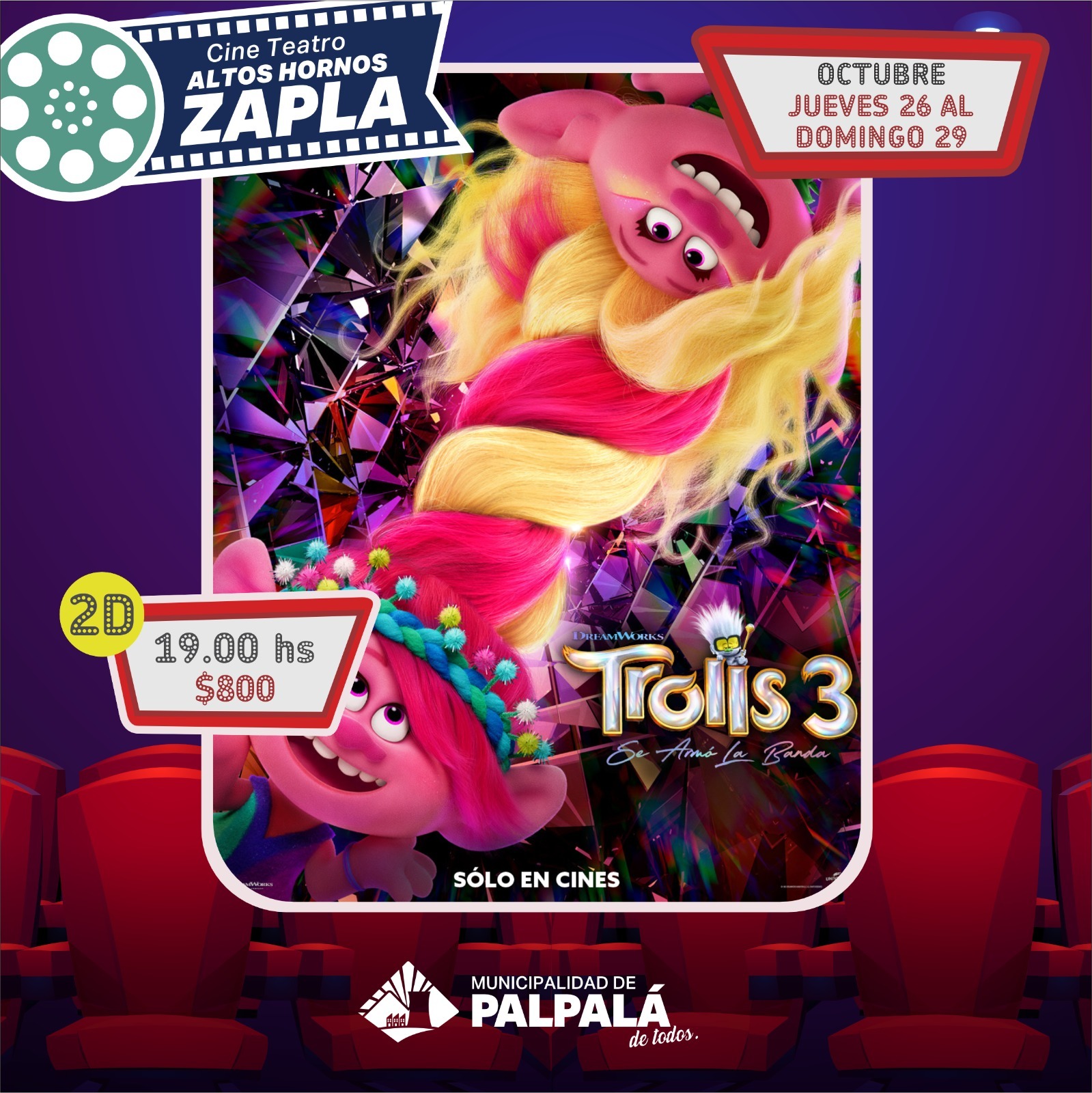 La Municipalidad de Palpalá anuncia la cartelera del cine Altos Hornos Zapla para el jueves 26 al sábado 29 de octubre, dando inicio a las 17 horas con “GUAPÓ Y” (espacio INCAA), el precio es de 400 pesos, en tanto que a las 19, se proyectará “TROLLS 3”, a 800 pesos la entrada y a las 21 horas “EL EXORCISTA: CREYENTES”, el costo es 800 pesos, todas en 2D. Se detalla que las boleterías abren una hora antes de cada función.