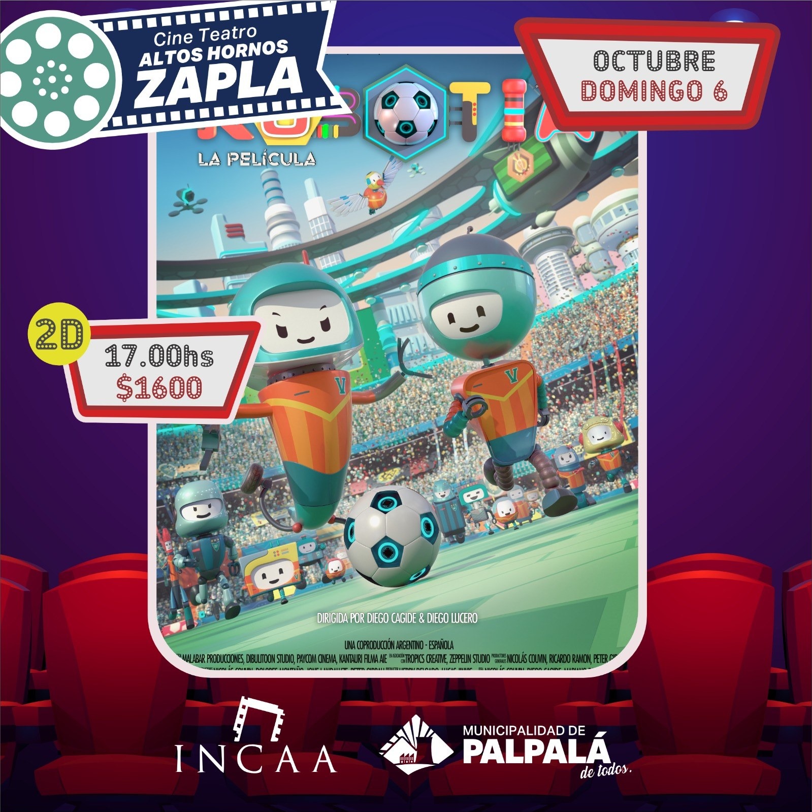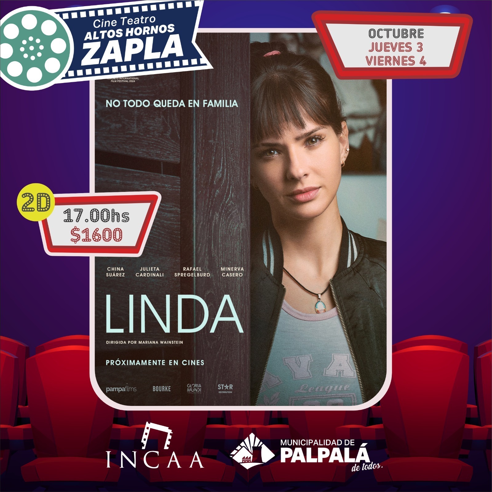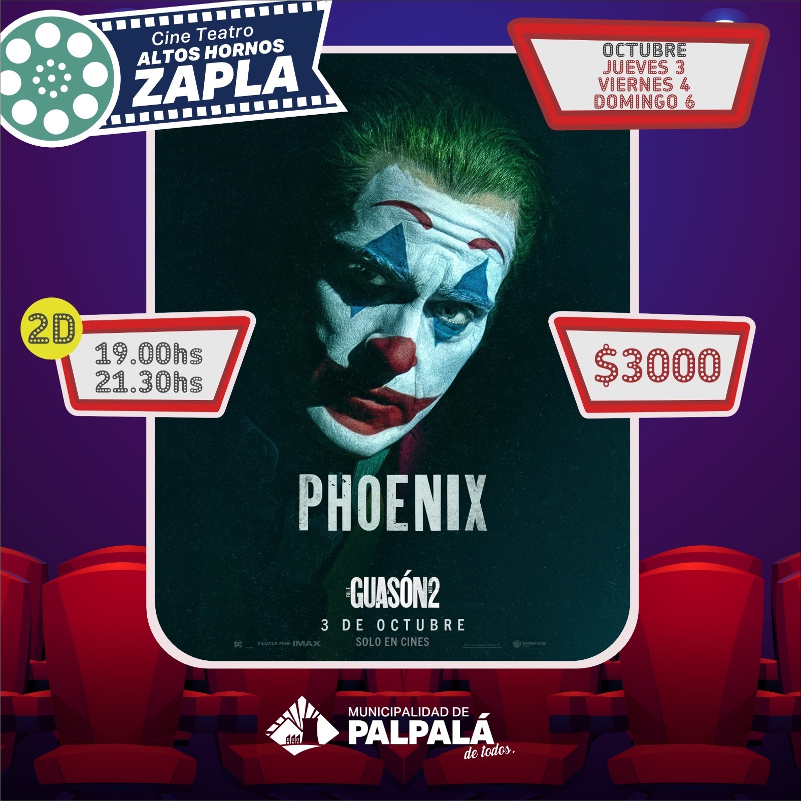 La Municipalidad de Palpalá anuncia la cartelera del jueves 3 al domingo 6 de octubre. Jueves, viernes y domingo se emitirá “PHOENIX: EL GUASON 2”, a las 19 y a las 21:30 horas, precio de la entrada 3000 pesos. También, jueves y viernes, desde las 17 horas, se proyectará “LINDA: NO TODO QUEDA EN FAMILIA”, con un costo de entrada de 1600 pesos. Finalmente, el domingo, desde las 17 horas, será el turno de “ROBOTIA”, con el mismo precio de entrada. Todas las funciones son en 2D.