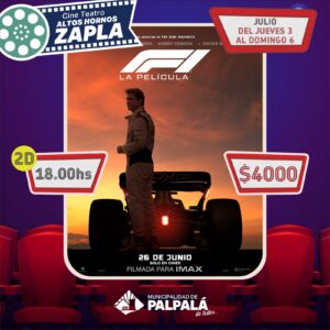 18 horas, “F1: LA PELÍCULA”, en 2D, costo de la entrada 4000 pesos.