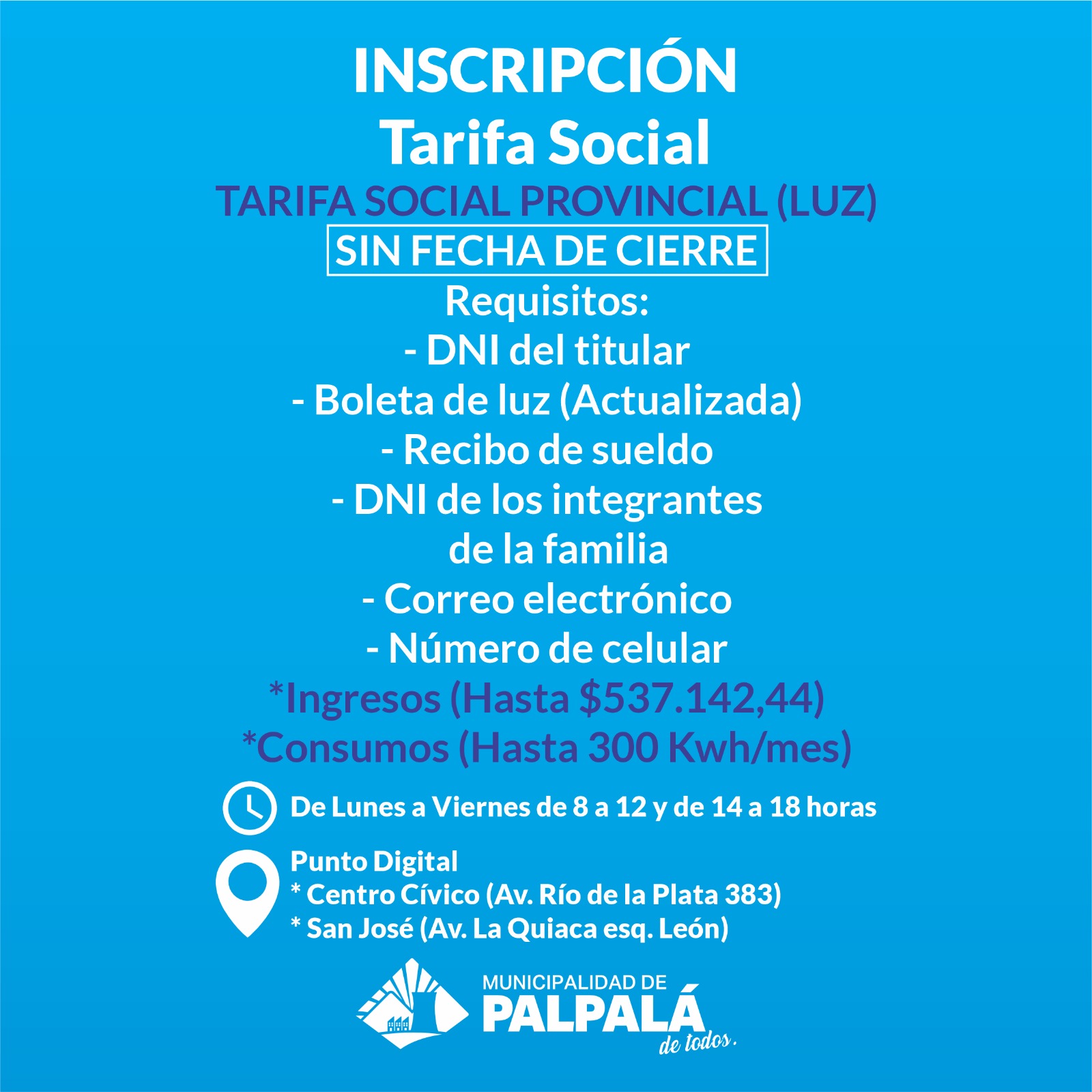 El ejecutivo local informa que sigue en vigencia la inscripción y actualización de datos de los beneficiarios de la «Tarifa Social». Podrán hacerlo de lunes a viernes, de 8 a 12:30 y de 14 a 18:30 horas, en el Punto Digital del Centro Cívico y Punto Digital del CIC del barrio San José.
