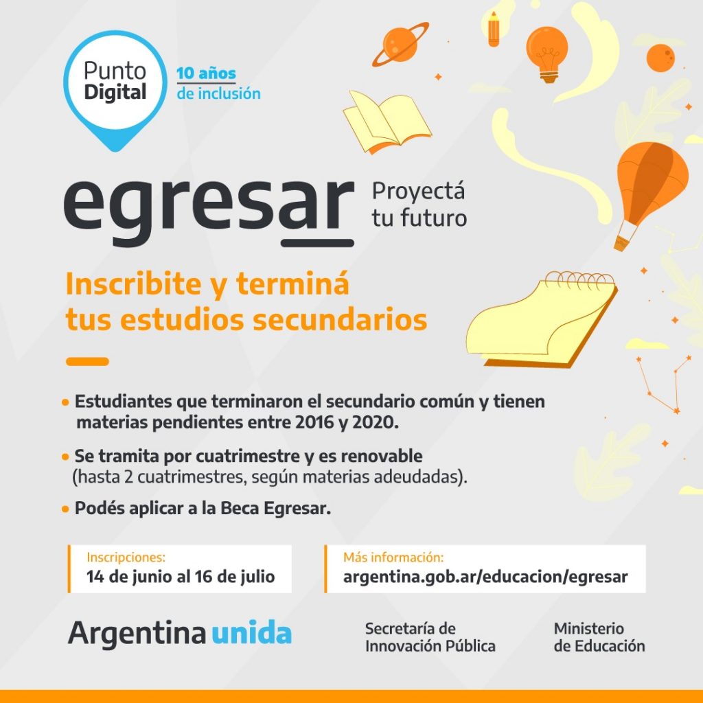 La municipalidad de Palpalá, informa que se encuentran abiertas las inscripciones del programa «Egresar» para aquellos que hayan terminado sus estudios secundarios entre los años 2016 y 2020, pero sin el acceso al título por materias pendientes.