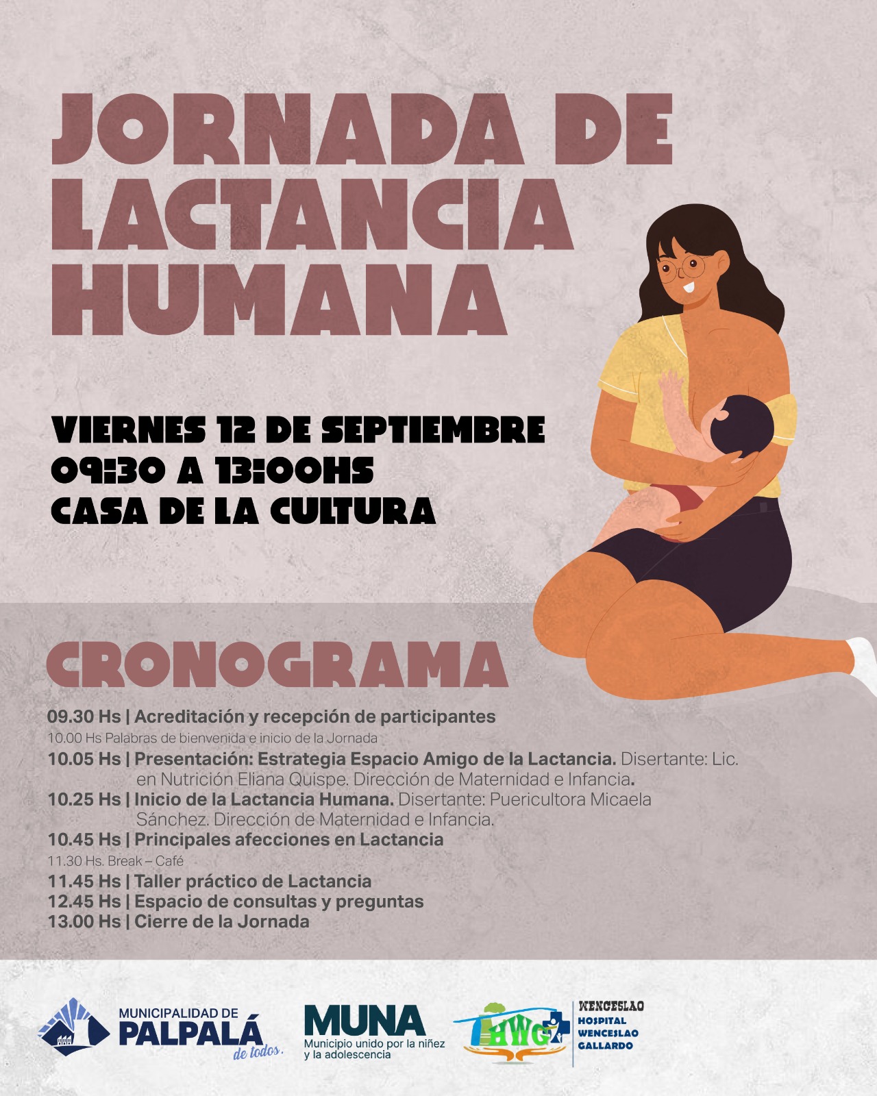 En el marco del mes de la lactancia, la Municipalidad de Palpalá informa que el viernes 12 Septiembre, se realizará una jornada de lactancia de 9.30 a 13 horas en la Casa de la Cultura, ubicada en avenida Del Congreso esquina Río Chubut. Cabe destacar, que la acreditación y recepción de participantes, se hará a las 9.30 horas, para luego  continuar con el siguiente cronograma: