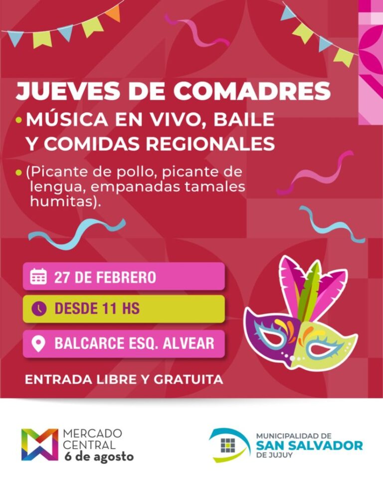 La familia jujeña está invitada a participar de una jornada llena de tradición, música, baile y sabores regionales en el esperado Jueves de Comadres, que se llevará a cabo este 27 de febrero desde las 11 horas en el Mercado Central “6 de Agosto”, ubicado en Alvear esquina Balcarce.
