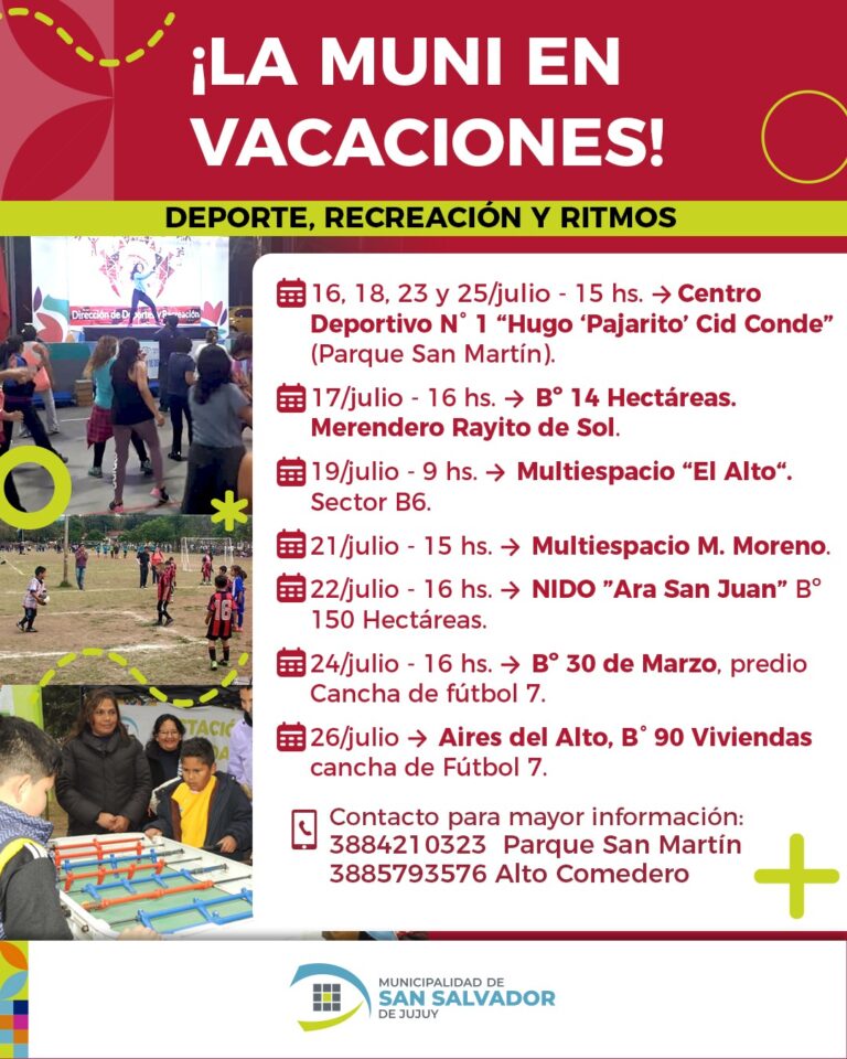 En el marco de la temporada invernal, la Municipalidad de San Salvador de Jujuy, a través de la Dirección de Deporte y Recreación, pondrá en marcha el programa “La Muni en Vacaciones”, una propuesta gratuita destinada a que las familias jujeñas disfruten de jornadas recreativas con juegos, peloteros y actividades para todas las edades. La iniciativa comenzará el miércoles 16 de julio, a partir de las 15 horas, en el Centro Deportivo Nº1 “Pajarito” Hugo Cid Conde, ubicado en el Parque San Martín, y se extenderá por distintos barrios de la ciudad.