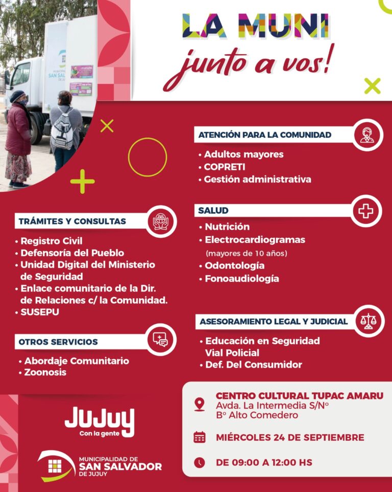 La Municipalidad de San Salvador de Jujuy continúa acercando sus servicios a los distintos barrios de la ciudad a través del programa “La Muni junto a vos”, que el próximo miércoles 24 de septiembre, de 9 a 12 horas, se instalará en el Centro Cultural Tupac Amaru, ubicado en avenida La Intermedia s/n°, del barrio Alto Comedero.