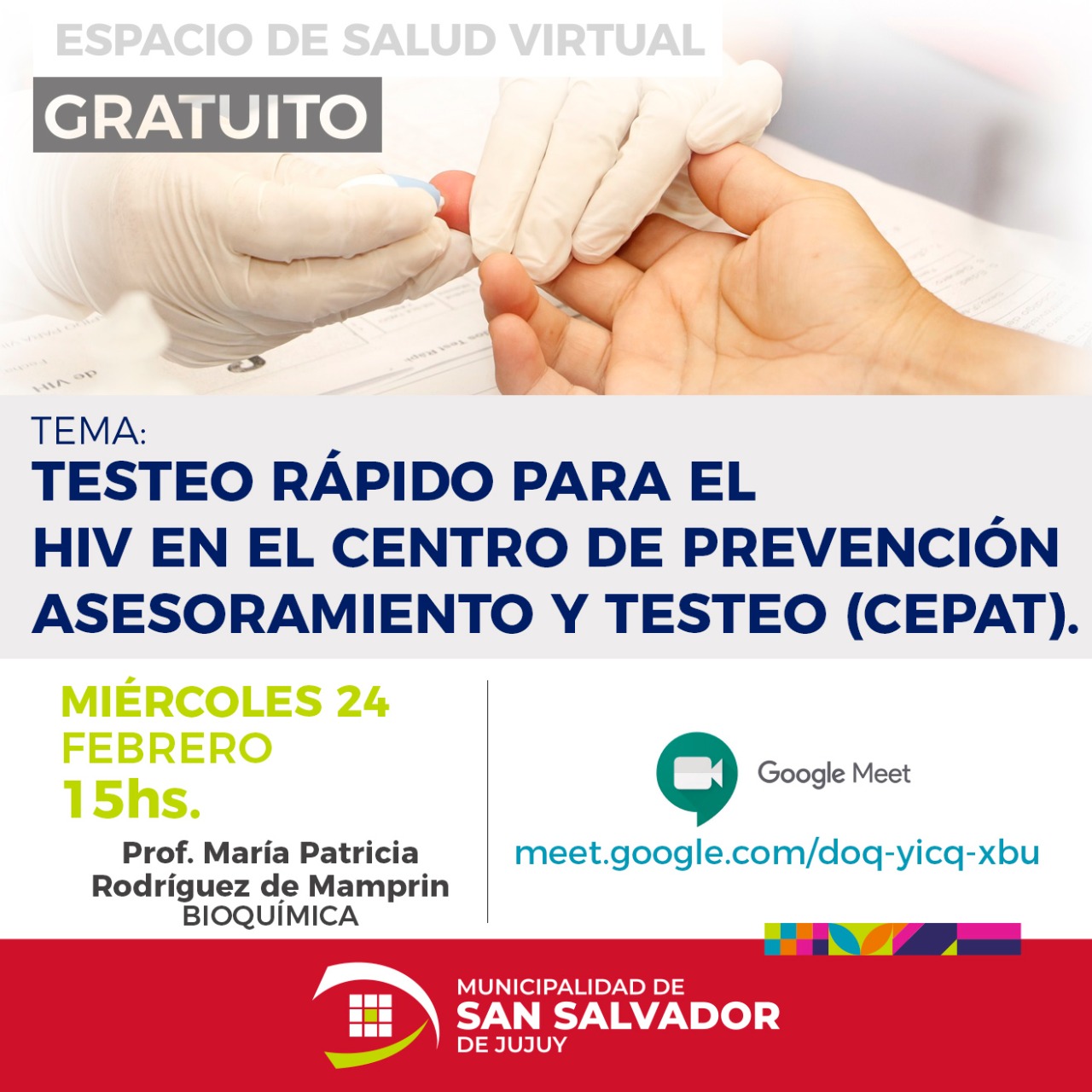La Municipalidad de la capital, desde la dirección de Salud, dependiente de la secretaría de Desarrollo Humano, dictará un taller para tomar conciencia sobre la problemática del VIH (Virus de Inmunodeficiencia Humana), y el acceso de manera voluntaria a los test gratuitos y confidenciales propuestos por el CEPAT (Centro de Prevención Asesoramiento y Testeo) Municipal para la detección temprana de enfermedades de transmisión sexual.