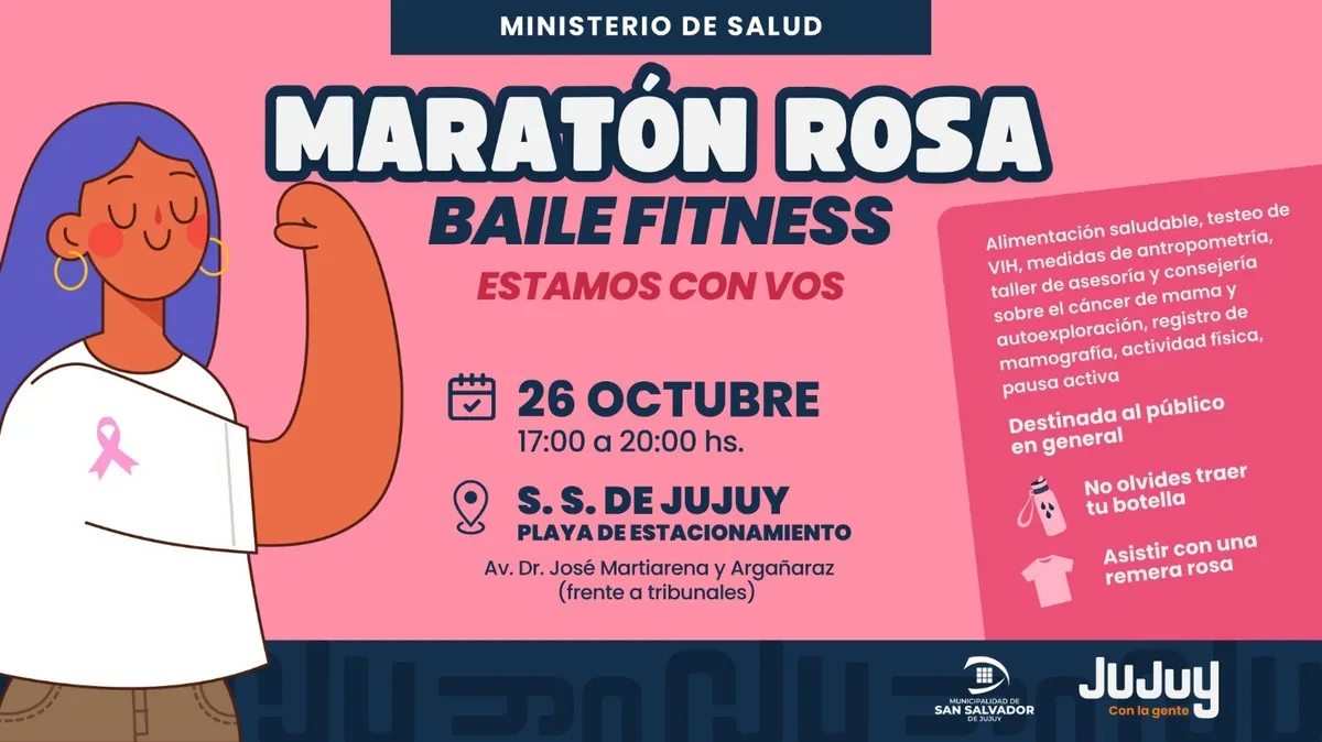 El Ministerio de Salud de Jujuy informó que, junto al Municipio de San Salvador de Jujuy y dando continuidad a las actividades por el mes de sensibilización frente al cáncer de mama, llevará adelante la Maratón Fitness Rosa “Estamos con vos” abierta a la participación de toda la comunidad, jornada en la que se realizaran distintas acciones de promoción y con servicios sanitarios a disposición.