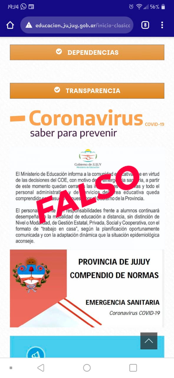 El Ministerio de Educación de la Provincia de Jujuy informa que esta información es FALSA. Y recuerda que toda la información actualizada procedente de la cartera educativa circula sólo mediante los canales oficiales.