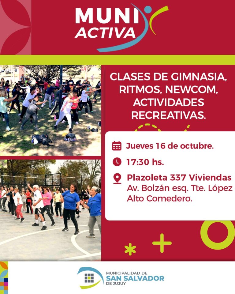 La Municipalidad de San Salvador de Jujuy invita a toda la comunidad a participar de una nueva edición de “Muni Activa”, una propuesta que promueve el deporte, la salud y la recreación para todas las generaciones. La actividad se realizará este jueves 16 de octubre a las 17.30 horas, en la Plazoleta 337 Viviendas, ubicada en avenida Bolzán esquina Teniente López, del barrio Alto Comedero.