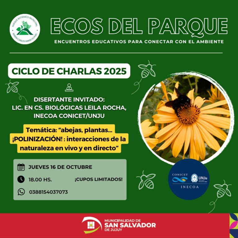 La disertación estará a cargo de la Lic. en Ciencias Biológicas Leila Rocha, investigadora del INECOA-CONICET/UNJu, quien compartirá su experiencia sobre la importancia ecológica y ambiental de las abejas y otros polinizadores.
