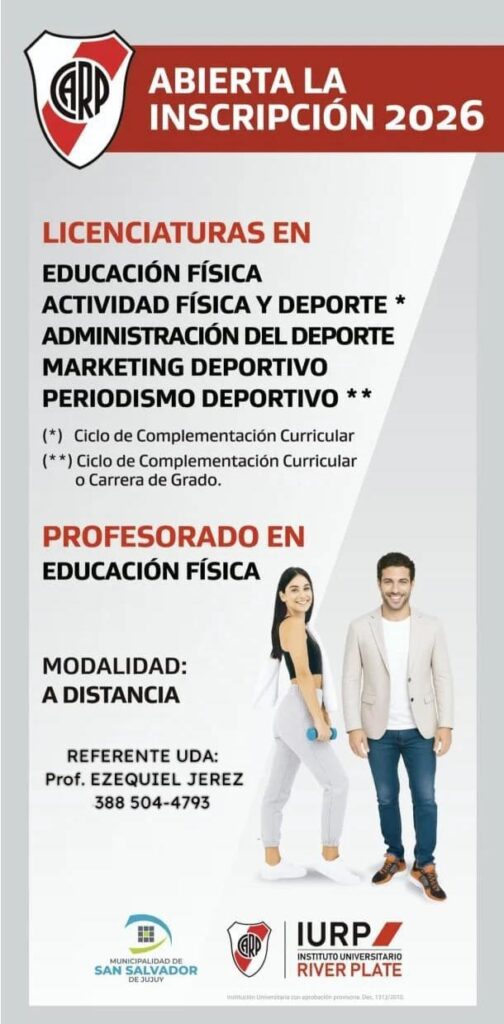 Las inscripciones continúan abiertas para el público en general, en el marco del convenio firmado entre la Municipalidad de San Salvador de Jujuy el Instituto Universitario River Plate, que permitirá desarrollar carreras universitarias, ampliar la oferta académica con modalidad online y espacios de práctica coordinados junto al Municipio.