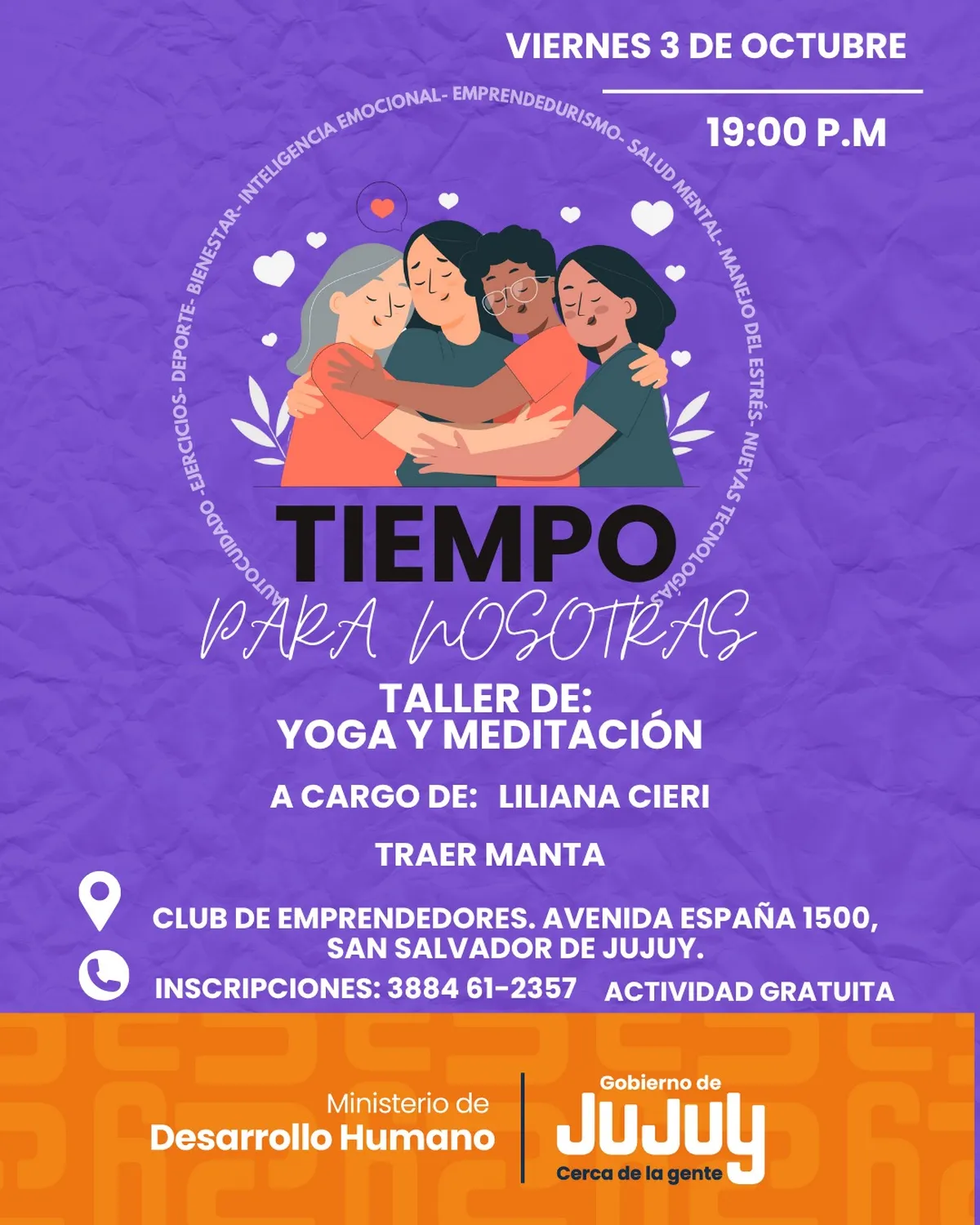 El Ministerio de Desarrollo Humano, a través de la Secretaría de Desarrollo Integral y la Coordinación de Calidad de Vida, invita a participar de una nueva jornada del ciclo “Tiempo para Nosotras”, un espacio diseñado para promover el bienestar integral, el autocuidado y la construcción de vínculos saludables entre mujeres.