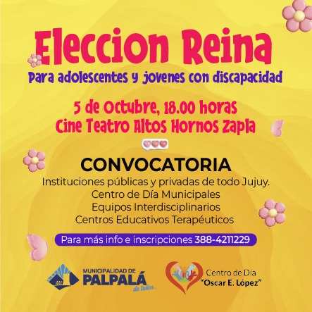 Palpalá catalogada como “Ciudad de evento”, realizará este sábado 5 de octubre, a las 18 en instalaciones del cine teatro Altos Hornos Zapla, la elección Reina para adolescentes y jóvenes con discapacidad. La gestión del intendente Rubén Eduardo Rivarola, se encuentra con los preparativos para recibir a las representantes de las diferentes instituciones tanto públicas y privadas, para que pasen una noche de gala con mucha emoción.