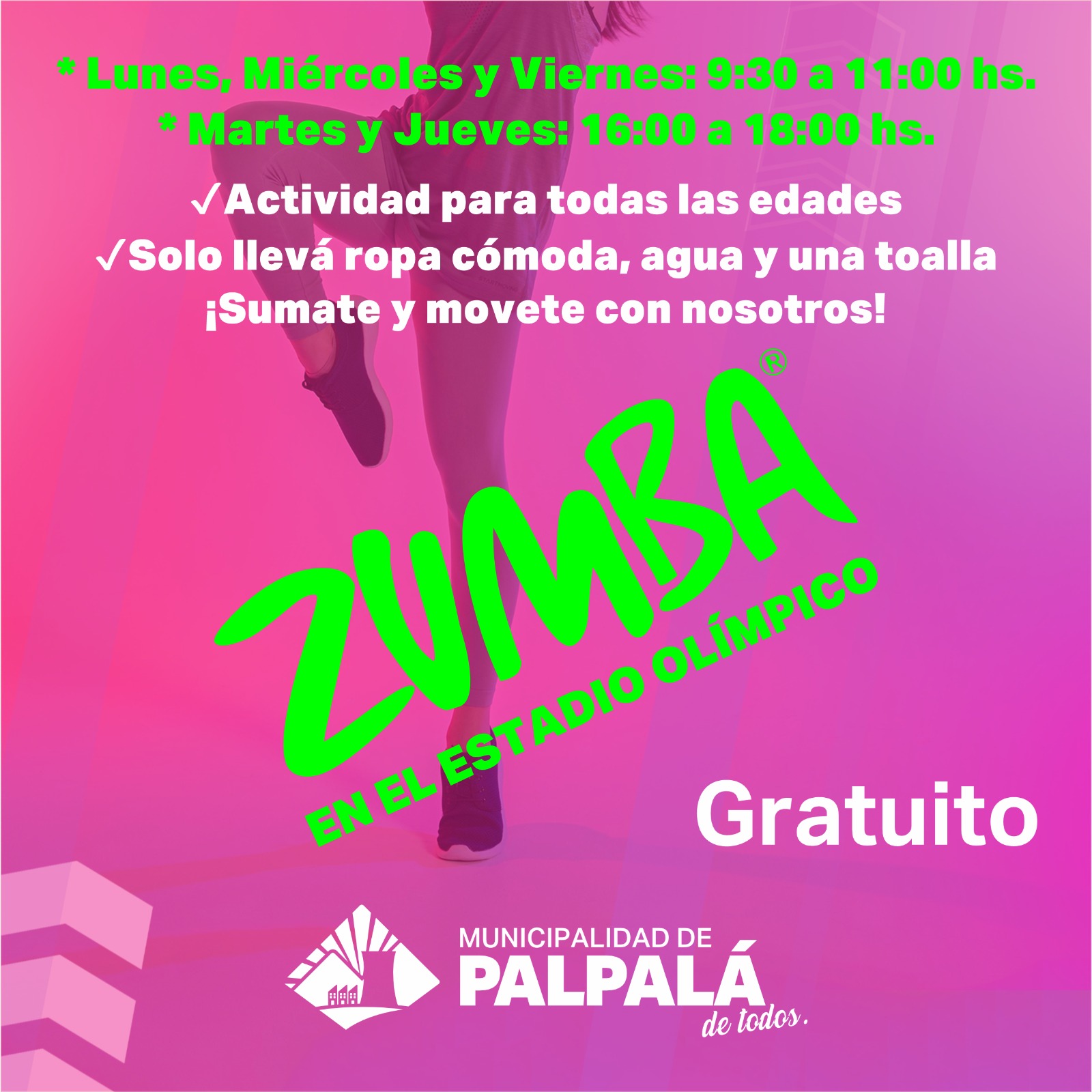 La Municipalidad de Palpalá a través de la dirección de Deportes, ofrece clases gratuitas de Zumba para todas las edades en el estadio Olímpico Municipal. Las clases se dictan los lunes, miércoles y viernes de 9.30 a 11 horas, y los martes y jueves de 16 a 18 horas. Para participar, solo se necesita ropa cómoda, agua para hidratarse y una toalla.