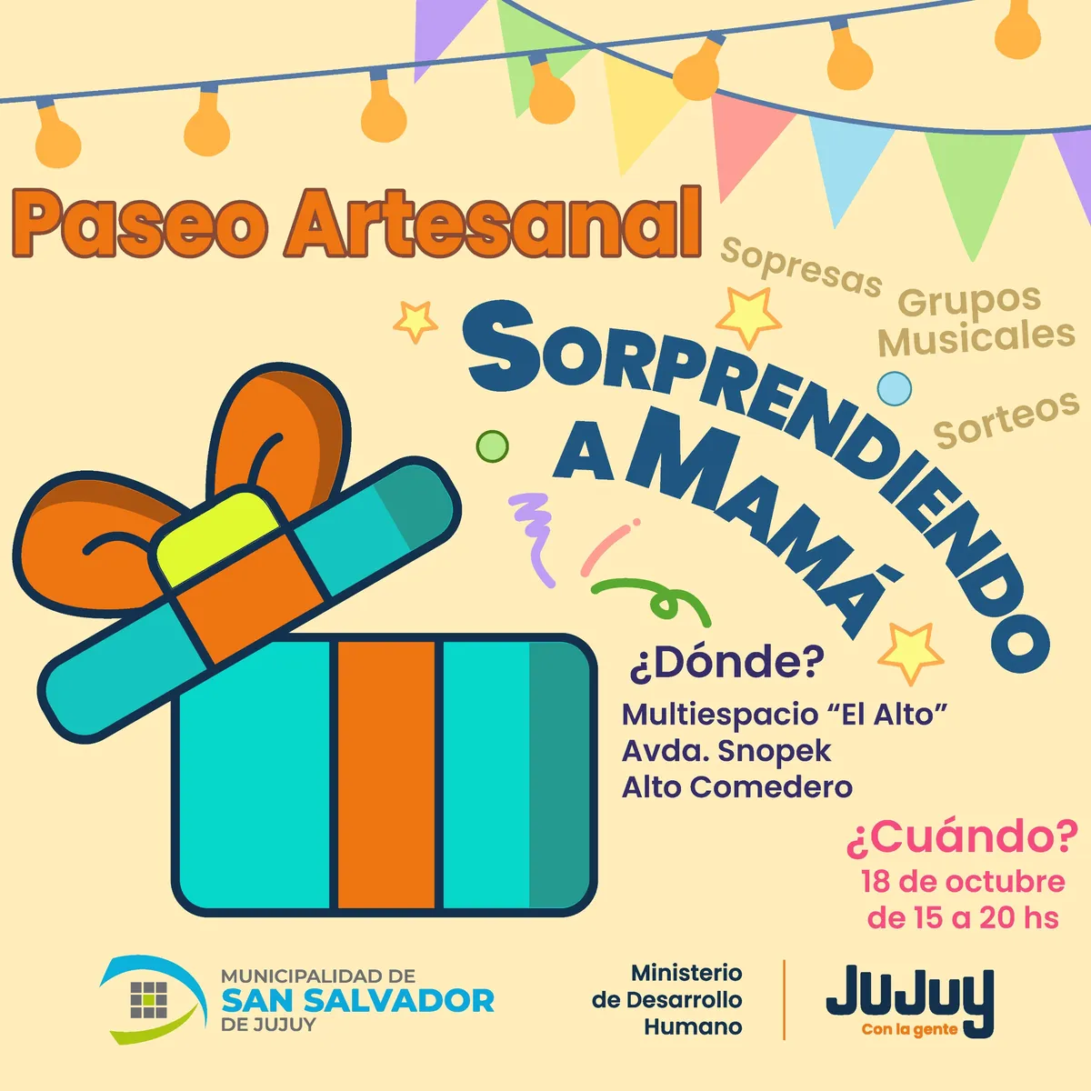 El Ministerio de Desarrollo Humano, a través de la Secretaría de Desarrollo Integral y la Coordinación de Economía Comunitaria, invita a toda la comunidad a participar en el Paseo Artesanal «Sorprendiendo a Mamá», que se llevará a cabo este viernes 18 de octubre en el Multiespacio «El Alto», ubicado en Avenida Snopek del barrio Alto Comedero, en la capital jujeña.