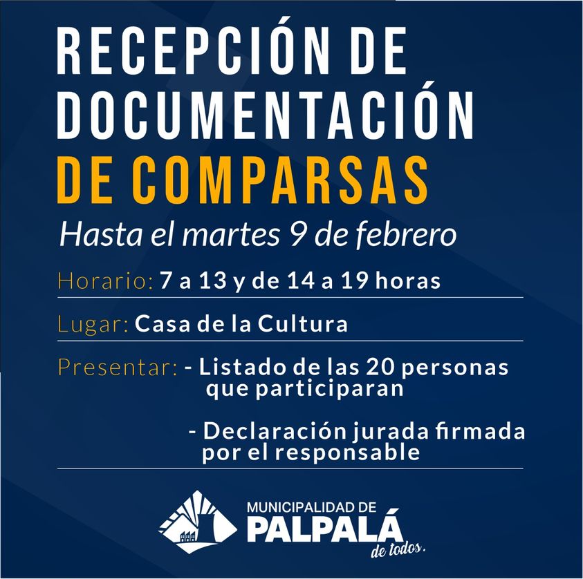 PalpalaPLAZO PARA PRESENTAR LISTA DE CARNAVALEROS HASTA EL 9 DE FEBRERO febrero 8, 2021febrero 7, 2021 Facebook Twitter WhatsApp ATENCIÓN COMPARSAS: RECEPCIÓN DE DOCUMENTACIÓN Informamos que la documentación deberá presentarse hasta el día martes 9 de febrero en la Casa de la Cultura, de 7 a 13 y de 14 a 19 horas. Deberán presentar: Listado de las 20 personas que participaran y declaración jurada firmada por el responsable. #MunicipalidadDePalpalá #DeTodos #Compromiso #ComparsasPalpalá #Carnaval2021 #DesentierrosPalpalá Facebook Twitter WhatsApp