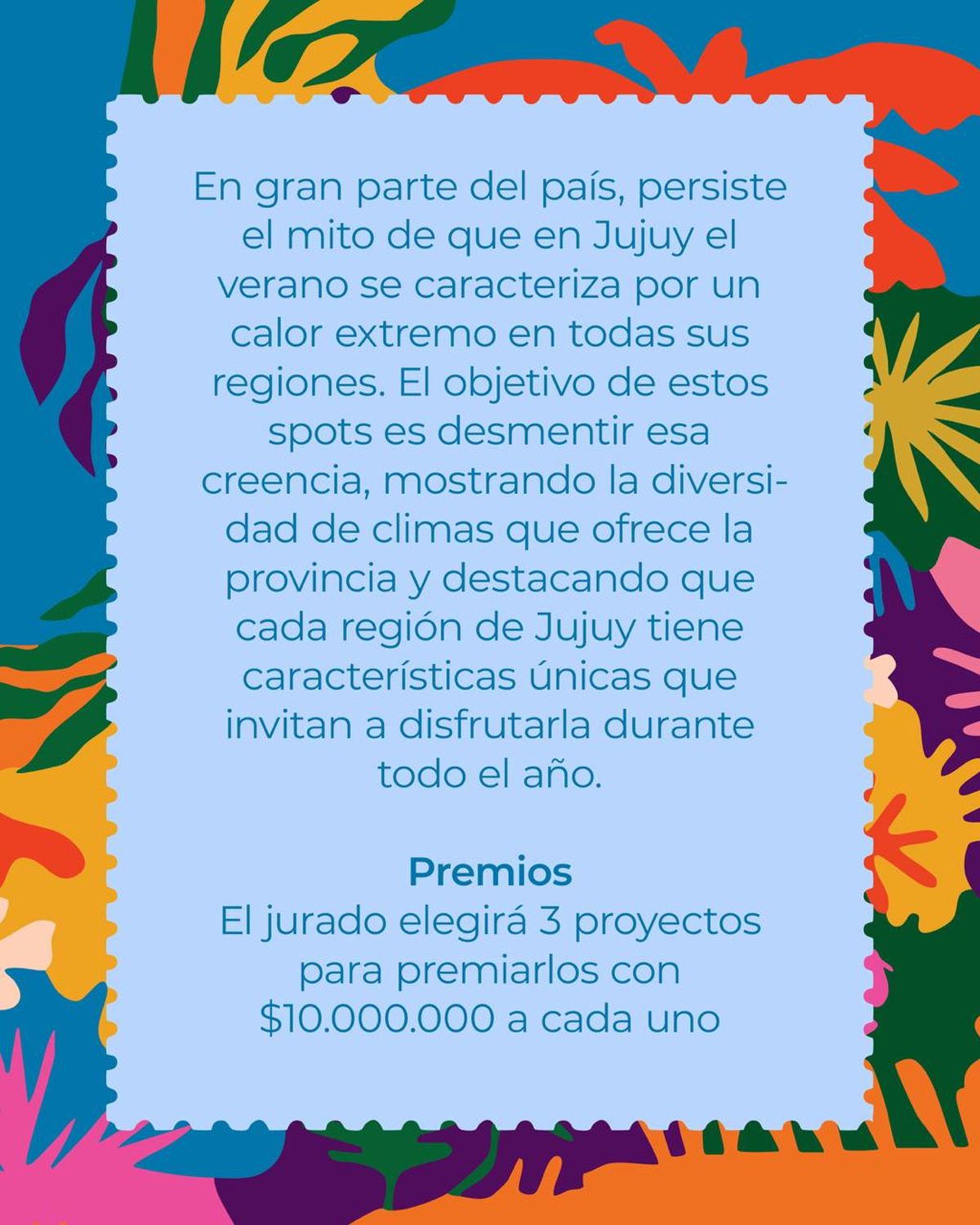 La invitación está destinada a creadores jujeños a producir spots publicitarios que muestren la verdadera diversidad climática del territorio, con inscripción abierta hasta el 26 de octubre y premios de diez millones de pesos para cada uno de los tres proyectos ganadores.
