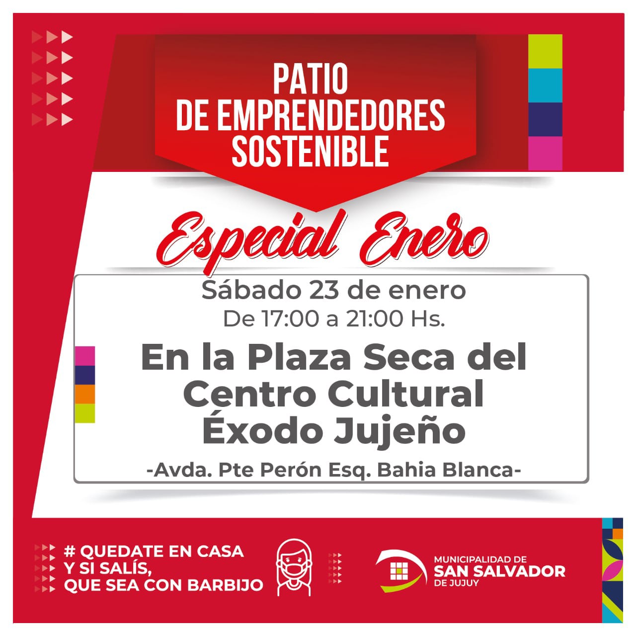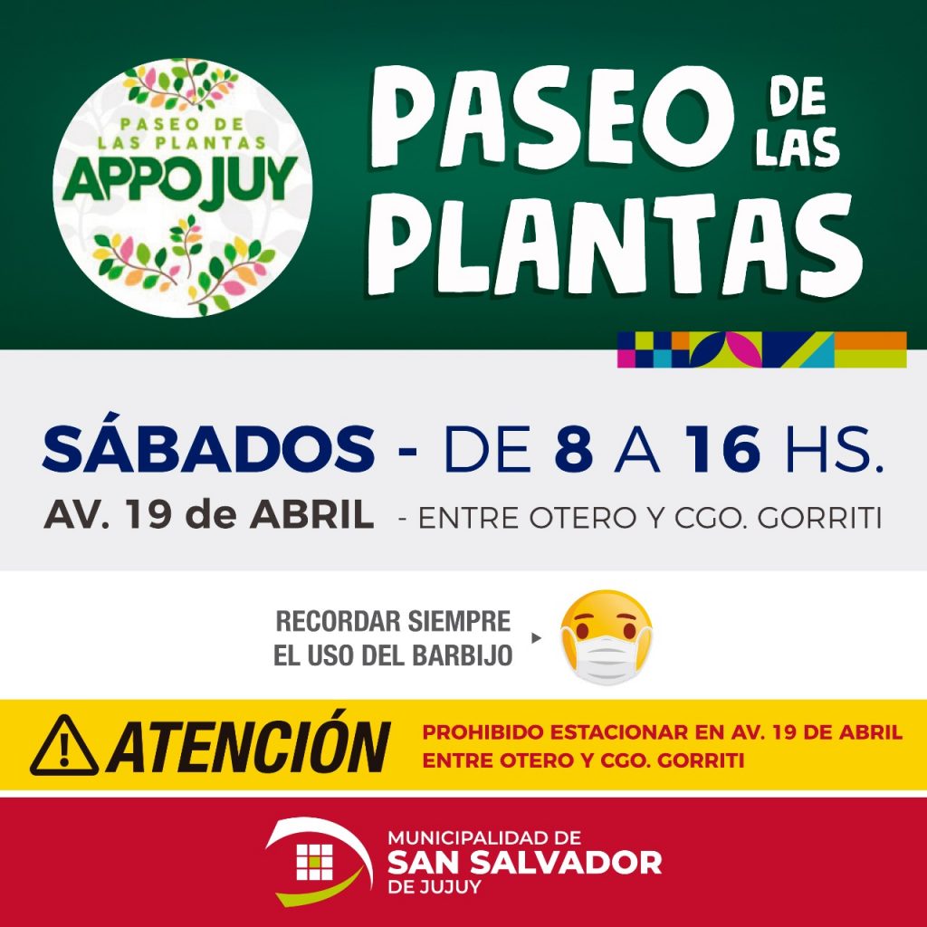 El sábado 23, en la av. 19 de Abril, a partir de las 8 hs. hasta las 16 hs., podrás visitar el Paseo de las Plantas. Este día, recordamos a los conductores que la playa de estacionamiento de la av. 19 de Abril, entre Otero y Cgo. Gorriti, permanecerá cerrada de 7 hs. a 17 hs. Luego desde las 16 hs. hasta las 21 hs., los emprendedores te esperan en el Patio de Emprendedores Sostenible, en la Plaza Seca del Centro Cultural Éxodo Jujeño. Y para finalizar, si el viernes no pudiste asistir al show de música que brindaba el Ciclo de Música en la Ciudad, no te preocupes, porque en la noche del sábado podrás ser parte del gran concierto del Grupo Jujeños, en el Centro Cultural Éxodo Jujeño.