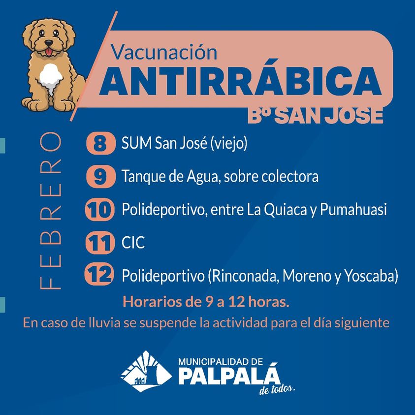 PalpalaREINICIA CAMPAÑA DE VACUNACION ANTIRRABICA EN PALPALA febrero 8, 2021febrero 7, 2021 Facebook Twitter WhatsApp RETOMAMOS LA CAMPAÑA DE VACUNACIÓN ANTIRRÁBICA Reanudamos con la vacunación antirrábica iniciando con el barrio San José. Estaremos vacunando este lunes 8 en el SUM del sector viejo. En el horario de 09 a 12 horas. #CampañaDeVacunación #MunicipalidadDePalpalá #DeTodos #Compromiso #Prevención #Salud Facebook Twitter WhatsApp