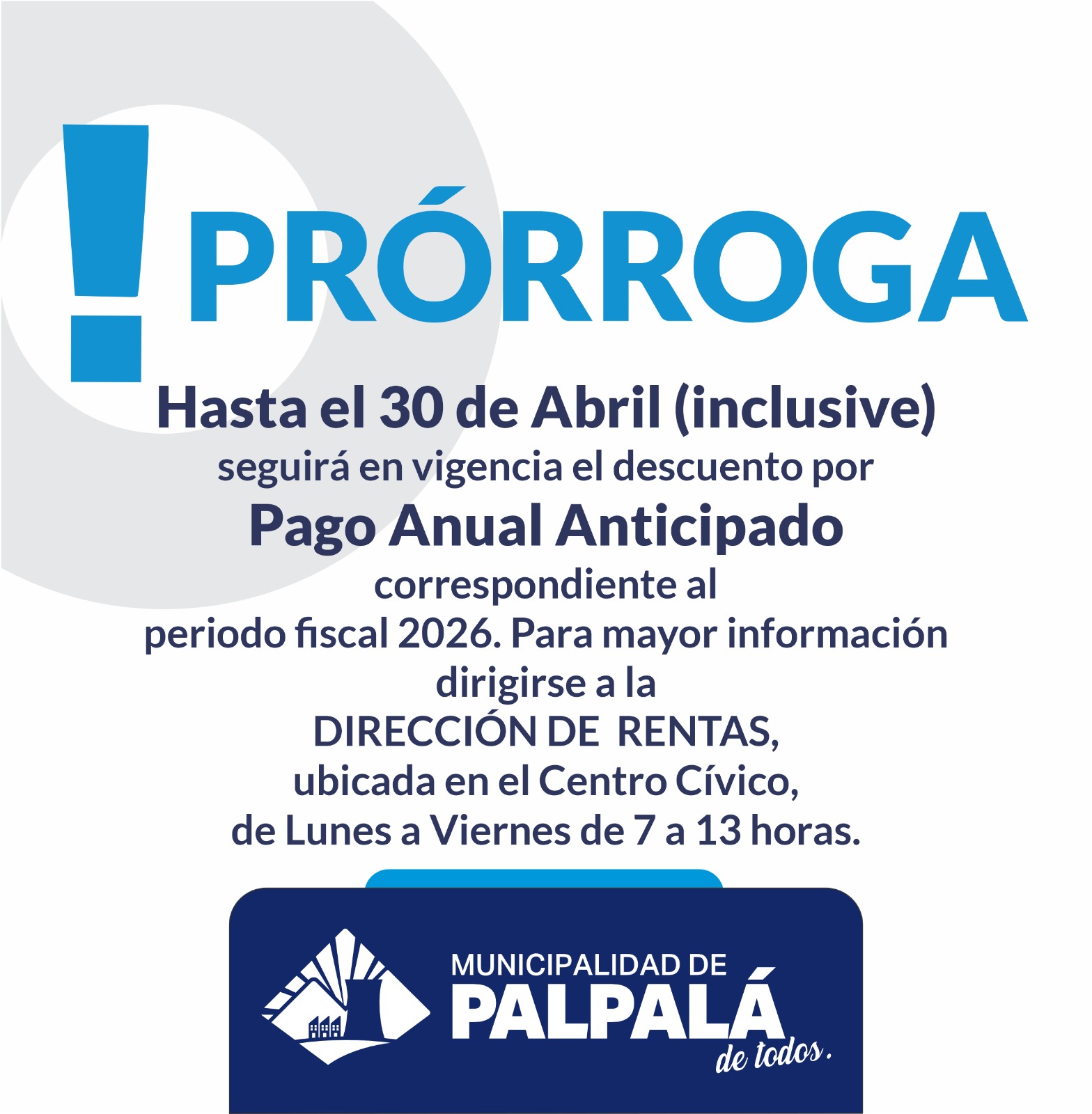 La dirección de Rentas de la Municipalidad de Palpalá, informa que hasta el día 30 de abril, inclusive, se extiende el plazo para el pago anual anticipado de los tributos municipales: servicios municipales, comercio, plataforma, automotores e inmuebles, ofreciendo descuentos del 20% al 30%. Se habilitan diversas opciones de pago, como tarjetas bancarias, QR y billeteras virtuales. Cabe destacar que con tarjeta Visa Macro el pago puede hacerse hasta en tres cuotas sin intereses. Los horarios de atención son de lunes a viernes, de 7 a 13 horas.