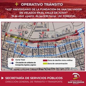 La Dirección de Tránsito y Transporte, dependiente de la Secretaría de Servicios Públicos de la Municipalidad de San Salvador de Jujuy, informó sobre el operativo especial de ordenamiento vehicular que se implementará durante el fin de semana, en el marco de las celebraciones oficiales. Las medidas dispuestas corresponden al sábado 18, en el marco de la Serenata a la Ciudad en Ciudad Cultural, y al domingo 19, por el acto protocolar y el desfile cívico, escolar y gaucho previstos por un nuevo aniversario de la fundación de San Salvador de Jujuy.