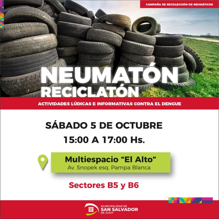 Este sábado 5 de octubre, de 15 a 17 horas, se llevará a cabo un nuevo Neumatón y Reciclatón en el Multiespacio “El Alto”, ubicado en el barrio Alto Comedero. La actividad forma parte de una campaña de recolección de materiales reciclables organizada por la Municipalidad de San Salvador de Jujuy, con el objetivo de promover el reciclaje y la conciencia ambiental entre los vecinos.