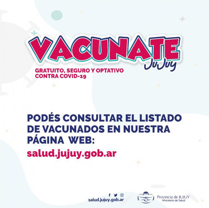 El Ministerio de Salud publicó a través de la web http://salud.jujuy.gob.ar/vacunatejujuy/ el listado completo de las personas que accedieron a la vacuna hasta la fecha.