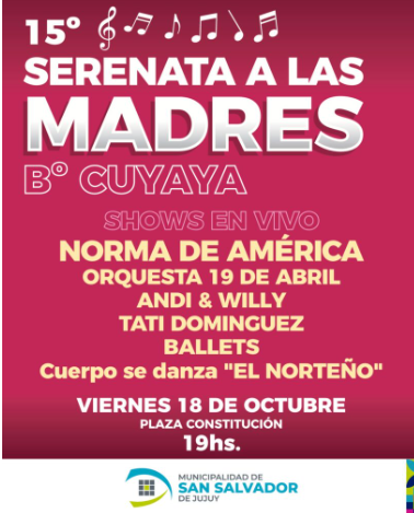 Como es tradicional en el mes de octubre la Municipalidad de San Salvador de Jujuy, a través de la Secretaría de Desarrollo Humano, brindará la XV Serenata a las Madres el día viernes 18 a realizarse en Plaza Constitución del barrio Cuyaya. La celebración estará amenizada con varias sorpresas y espectáculo musical desde las 19 horas con destacados artistas.