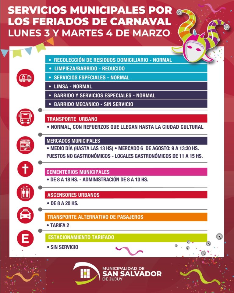 La Municipalidad de San Salvador de Jujuy informó la modalidad de prestación de servicios municipales los días lunes 03 y martes 04 de marzo con motivo del feriado nacional por carnaval.
